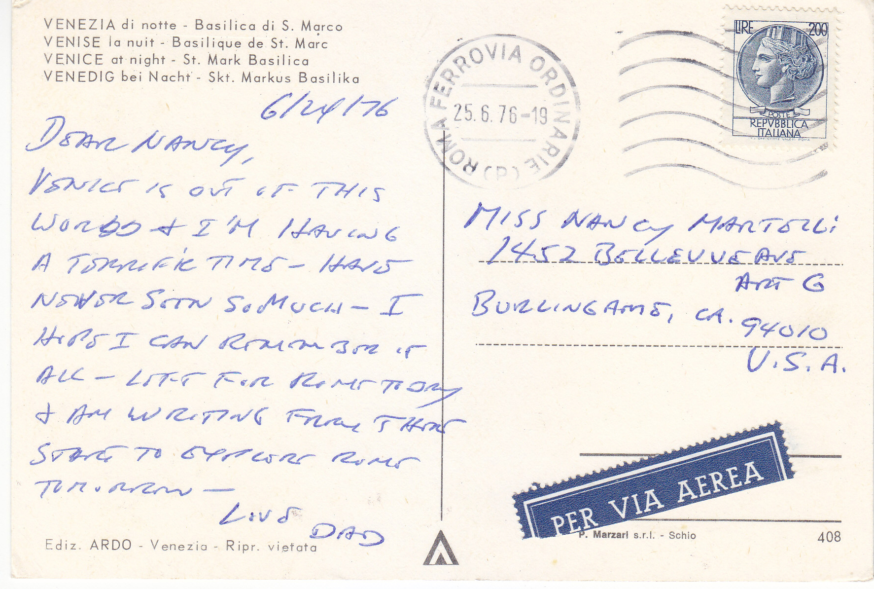 POSTCARD #221 Basilica di San Marco, Venezia [Venice, Italy]. 408. Ediz. ARDO, Venezia. Ripr. vietata. P. Marzari s.r.l. Schio. 5.75" x 4" VG