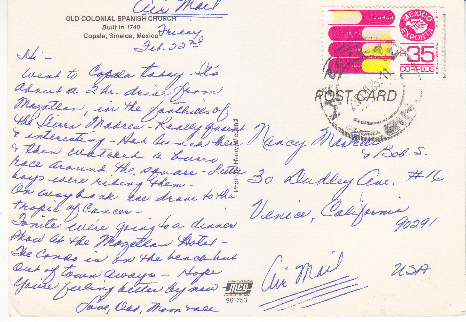 POSTCARD #233 Old Colonial Spanish Church, Built in 1740, Copala, Sinaloa, México. 961753. McG. McGrew Color Graphics. Kansas City, MO 64108. Photo by Henry Wiegand. 5.75" x 4" VG