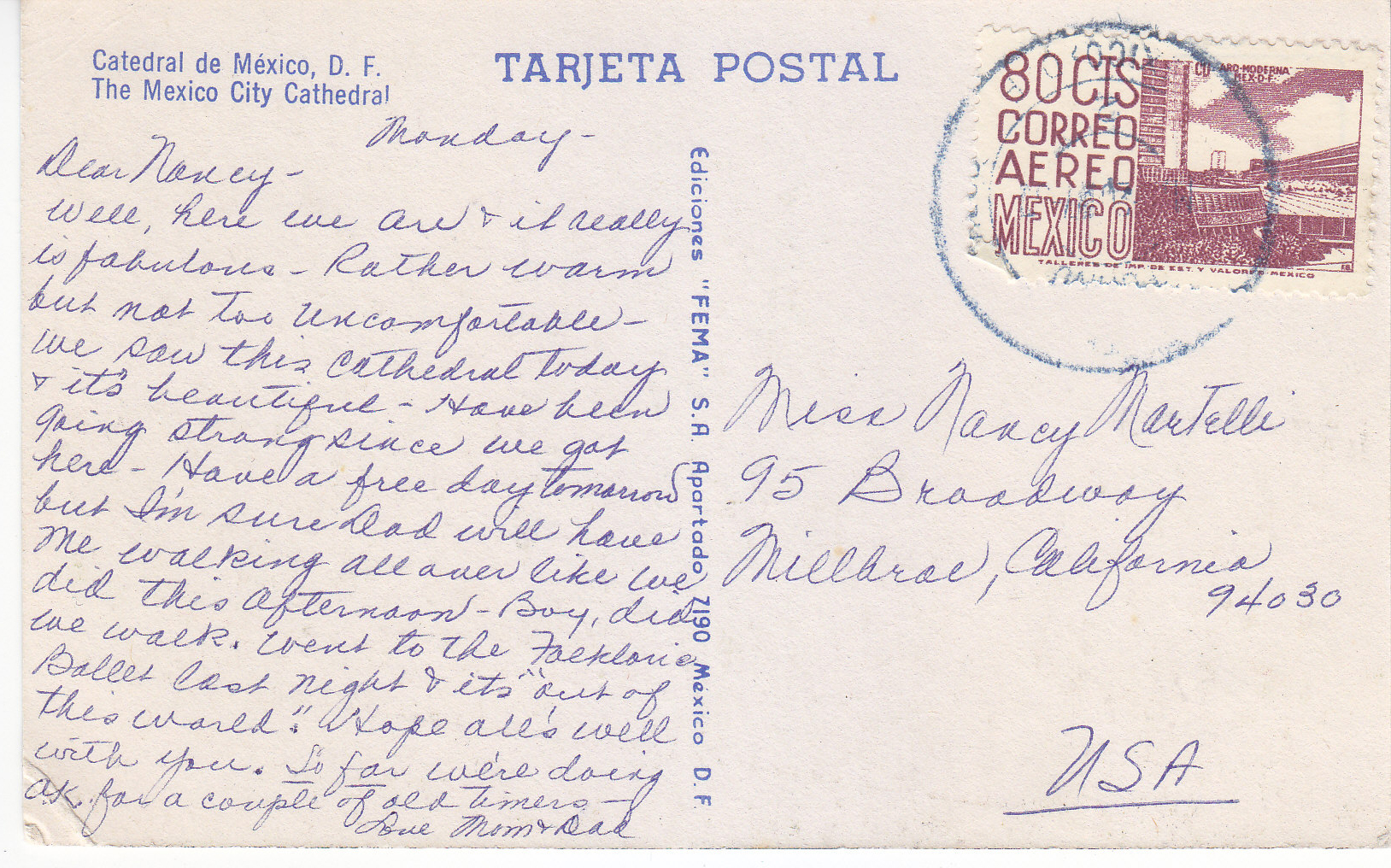 POSTCARD #275 Catedral de México, D.F., [The México City Cathedral, México City, México]. Tarjeta Postal. Ediciones FEMA S.A. Apartado 7190, México, D.F. 5.25" x 3.25" GD