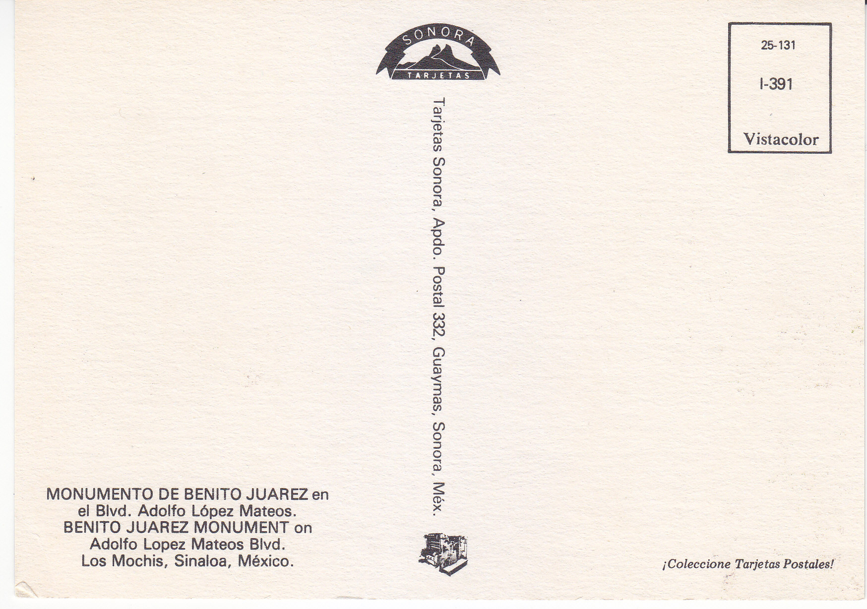 POSTCARD #316 Benito Juarez Monument on Adolfo Lopez Mateos Blvd., Los Mochis, Sinaloa, México. Coleccione Tarjetas Postales! 25-131. I-391. Vistacolor. Tarjetas Sonora, Apdo. Postal 332, Guaymas, Sonora, México. 5.75" x 4" EXC