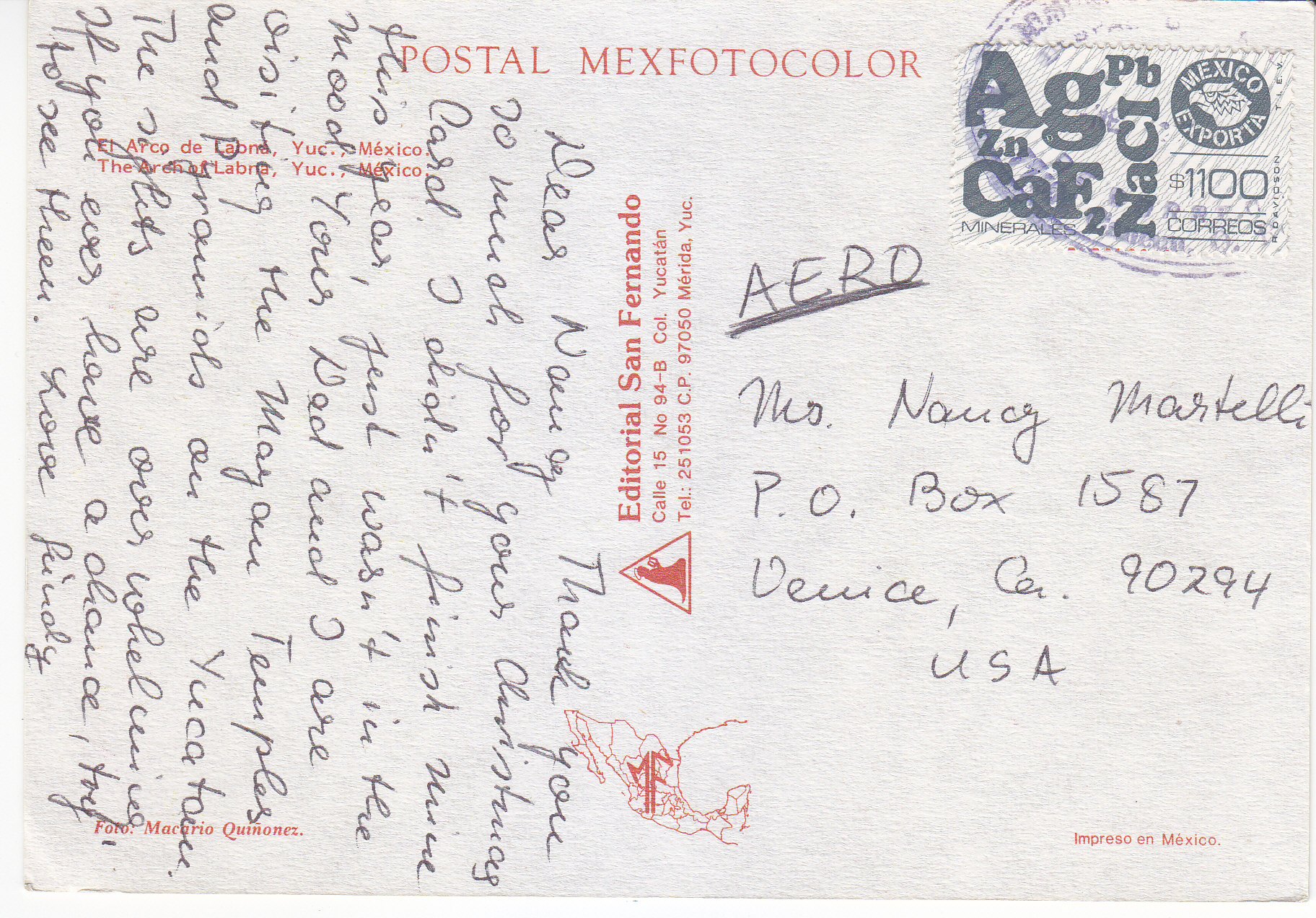 POSTCARD #333 The Arch of Labnà [Labnà, Yucatán, México]. Postal Mexfotocolor. Impreso en México. Editorial San Fernando. Calle 15 No 94-B, Col. Yucatán. Tel.: 251053 C.P. 97050 Mérida, Yucatán, México. 6" x 4" EXC
