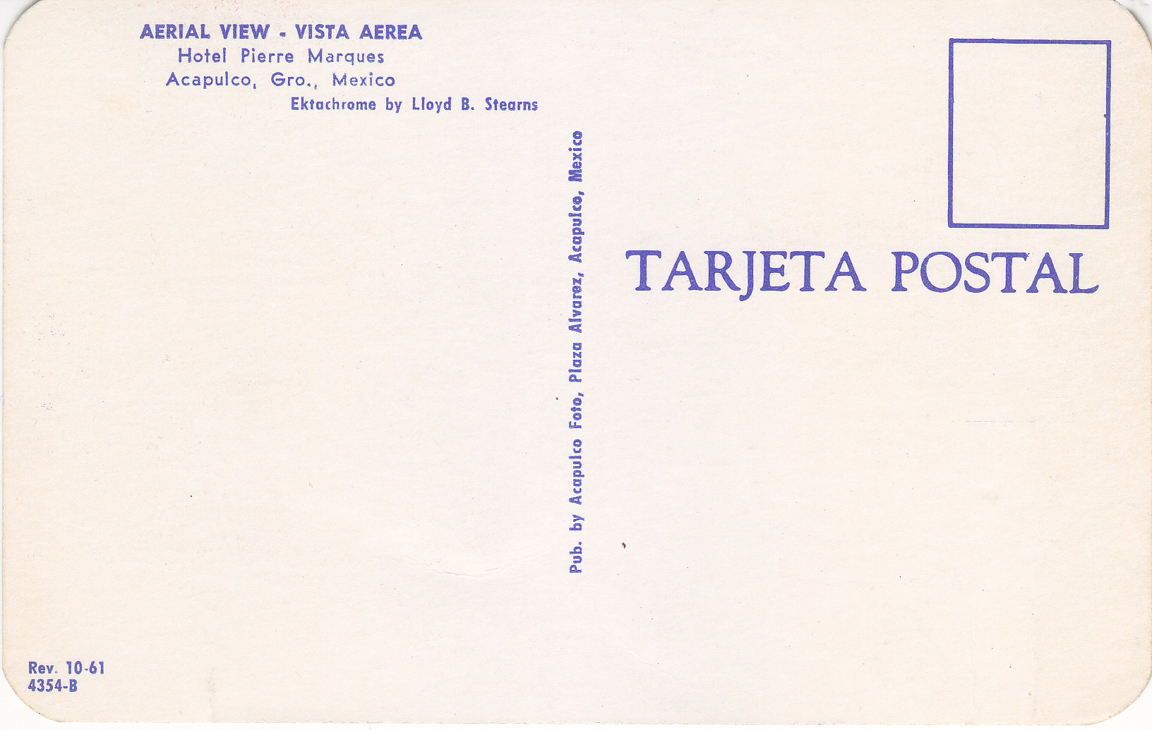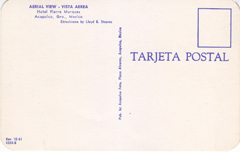 POSTCARD #371 Aerial View, Hotel Pierre Marques, Acapulco, Gro. [Guerrero, México]. Ektachrome by Lloyd B. Stearns. Rev. 10-61. 4354-B. Pub. by Acapulco Foto, Plaza Alvarez, Acapulco, México. Tarjeta Postal. 5.5" x 3.5" VG