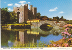 POSTCARD #295 Bunratty Castle, situated between Limerick and Shannon Airport, Co. Clare, Ireland. Color Photo by John Hinde, F.R.P.S. John Hinde Original. 2/31. Bunratty Castle. All over Ireland there are impressive reminders of a long and robust history -- pre-historic forts, strongholds, medieval castles, picturesque abbeys and monasteries. Bunratty, ten miles from Limerick City, is one of the largest of the towered fortresses of Ireland. It has been completely restored, and furnished in the style of the period, so that it is one of the most interesting examples of mediaeval times to be found today. Printed and Published by John Hinde Limited, Cabinteely, Co. Dublin, Irish Republic. 6" x 4" VG