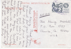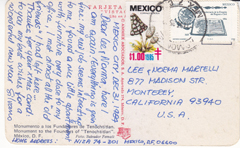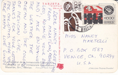 POSTCARD #206 Mazatlán [Sinaloa, Mexico]. Paseo Centenario. El Clavadista. Olas Altas. Playa Norte. Tarjeta Postal Vistacolor. Lito en México. Litografica Turmex, S.A. [Address obscured by mailing label.] Coleccione Tarjetas Postales! 5.5" x 3.5" VG