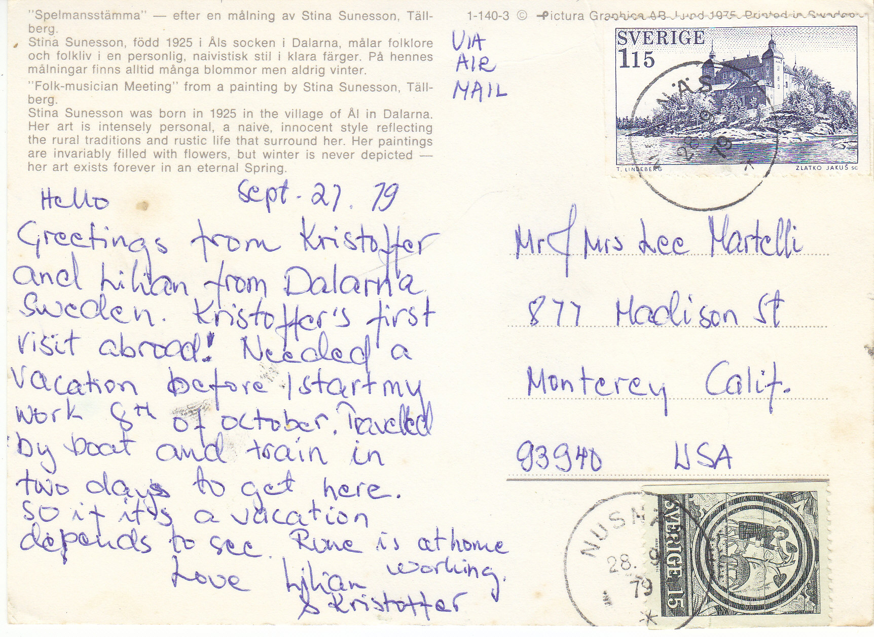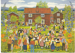 POSTCARD #088 Spellmansstämma, efter en målning av Stina Sunesson Täilberg [Spellman's Meeting, after a painting by Stina Sunesson Täilberg]. Stina Sunesson was born in 1925 in the village of Ål in Dalarna [Sweden]. Her art is intensely personal, a naive, innocent style reflecting the rural traditions and rustic life that surround her. Her paintings are invariably filled with flowers, but winter is never depicted -- her art exists forever in an eternal Spring. 1-140 Copyright Pictura Graphica AB [The rest is covered by stamp. Text is in Swedish and English.] 5.75" x 4.25" GD