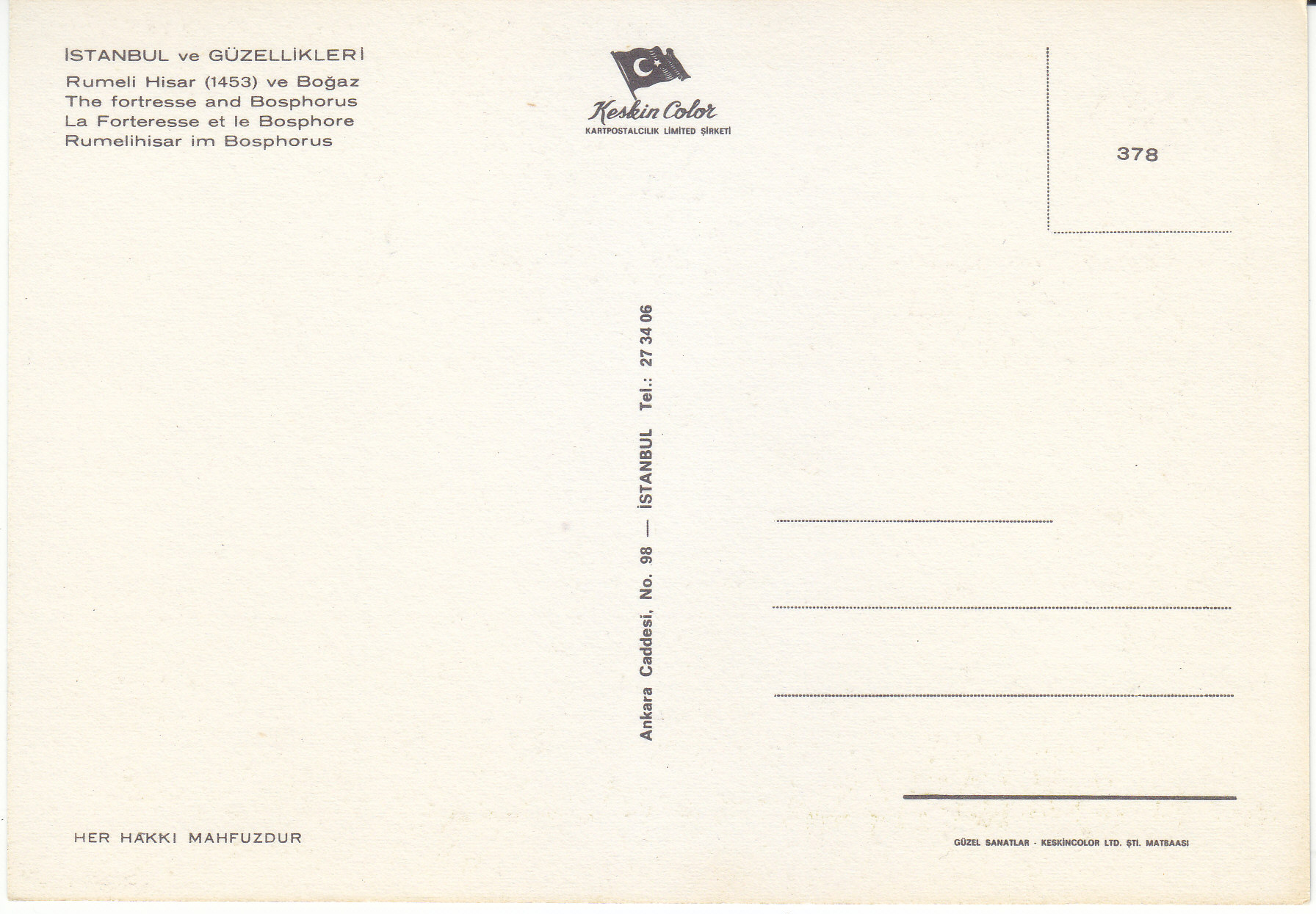 POSTCARD #114 The Fortresse and Bosphorus, Istanbul (Turkey). Her Hakki Mahfuzour. Keskin Color. Kartpostalcilik Limited Şirkiti. 49. Ankara Caddesi, No. 98, Istanbul Tel.: 27 34 06. Güzel Sanatlar. Keskin Color Ltd. Şti. Matabaasi. 6" x 4" EXC