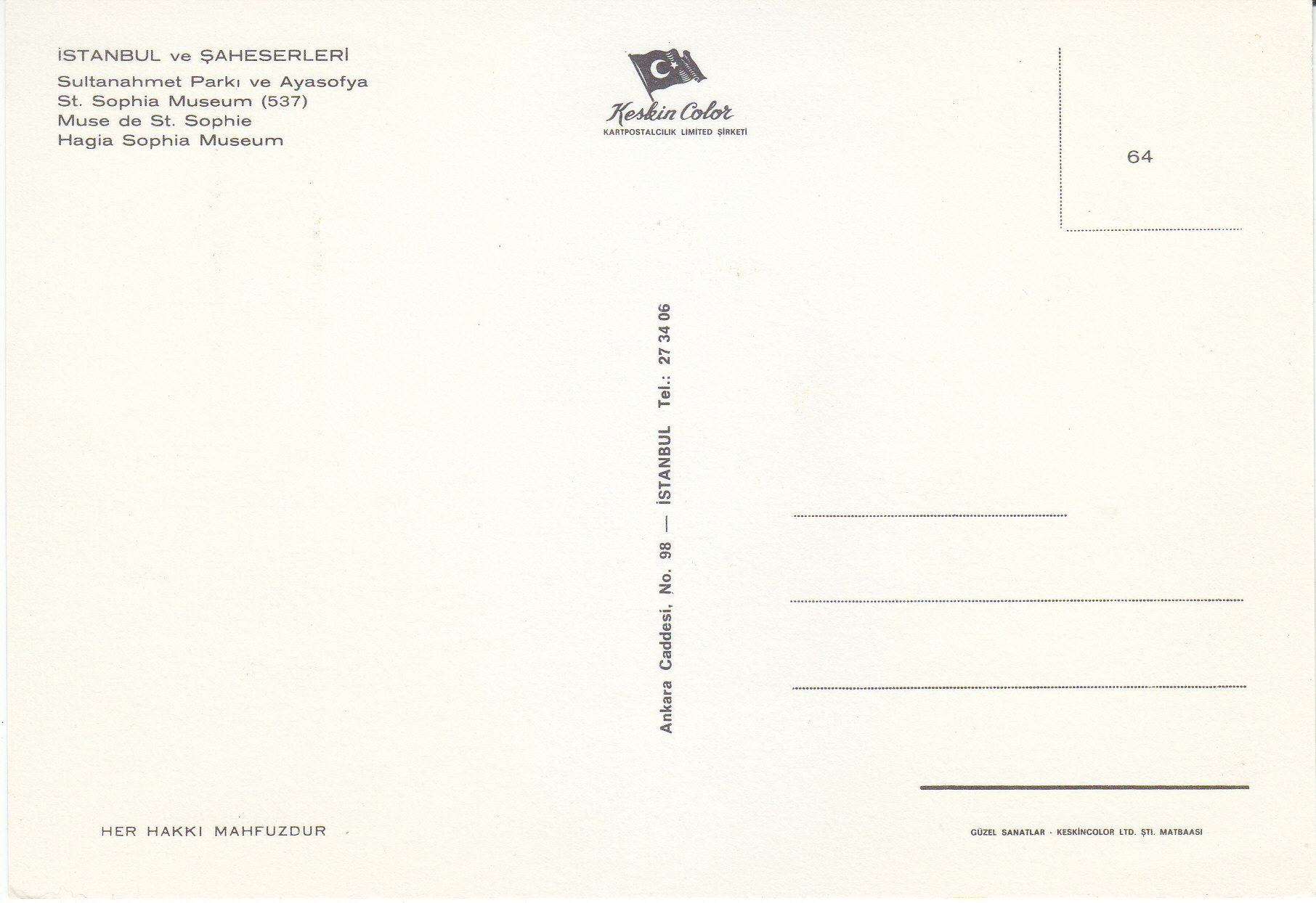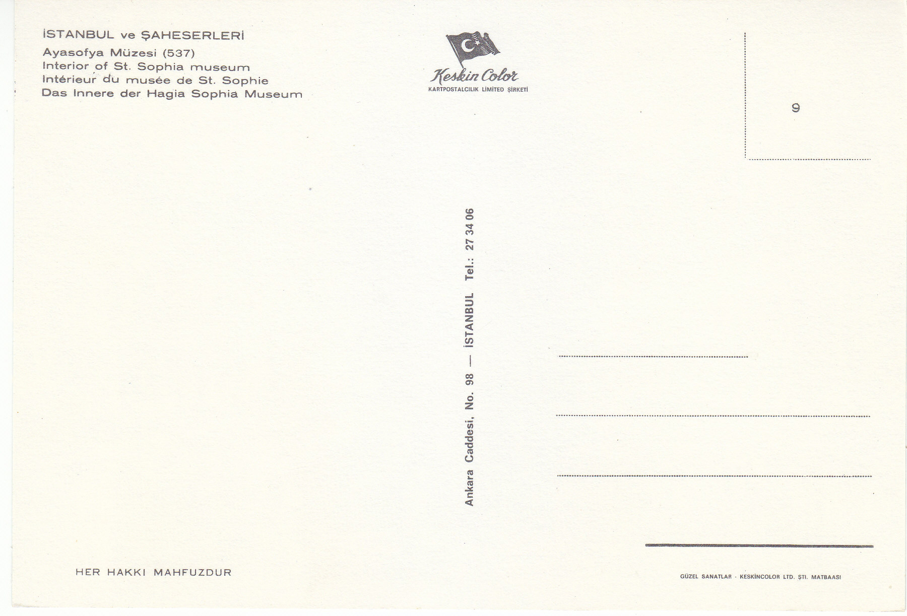 POSTCARD #120 St. Sophia Museum, Istanbul [Turkey]. Her Hakki Mahfuzour. Keskin Color. Kartpostalcilik Limited Sirkiti. 537. 64. Ankara Caddesi, No. 98, Istanbul Tel.: 27 34 06. Guzel Sanatlar. Keskin Color Ltd. Sti. Matabaasi. 6" x 4" EXC