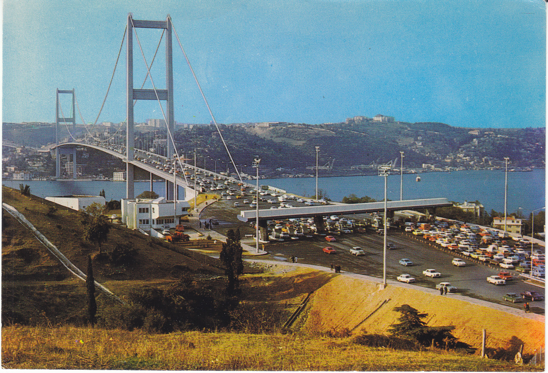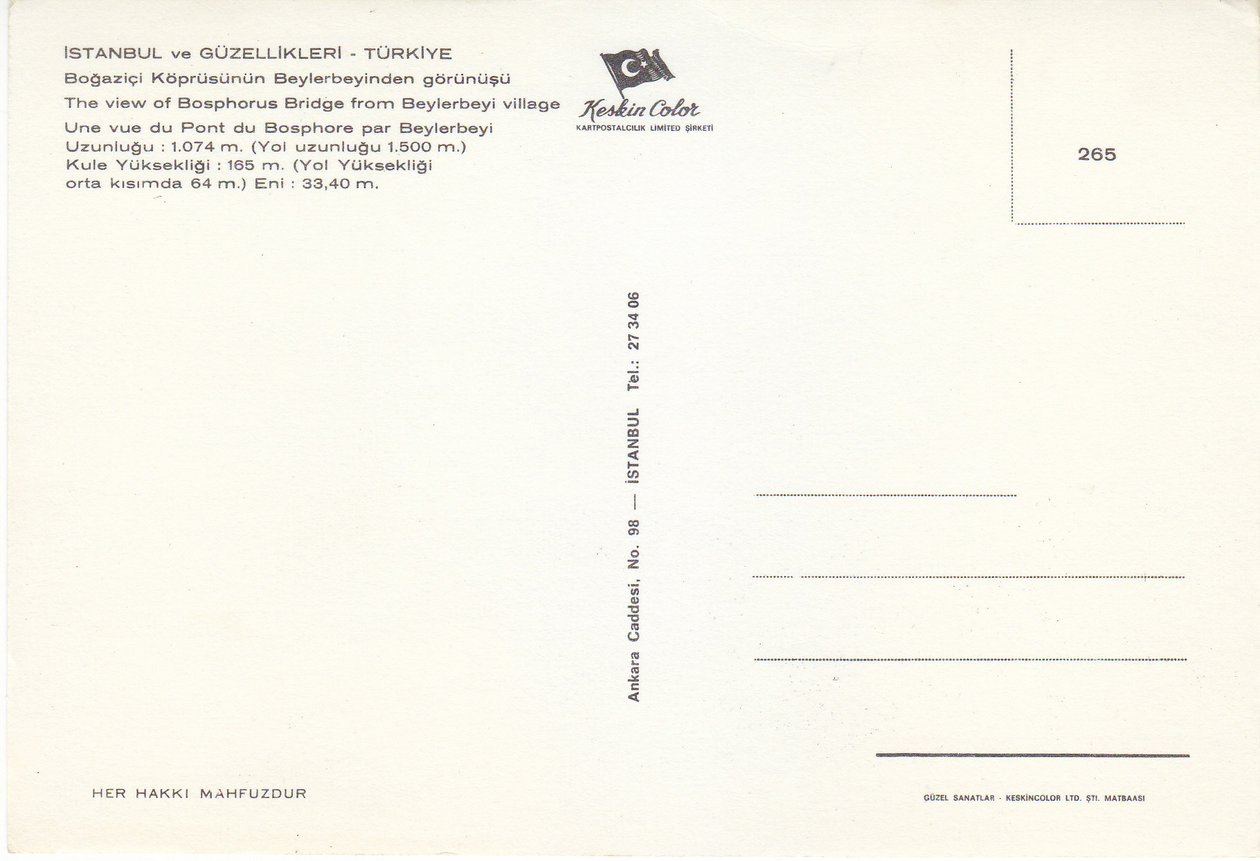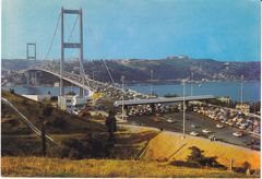 POSTCARD #116 View of Bosphorus Bridge from Beylerbeyi village, Istanbul [Turkey]. Her Hakki Mahfuzour. Keskin Color. Kartpostalcilik Limited Şirkiti. 49. Ankara Caddesi, No. 98, Istanbul Tel.: 27 34 06. Güzel Sanatlar. Keskin Color Ltd. Şti. Matabaasi. 6" x 4" EXC