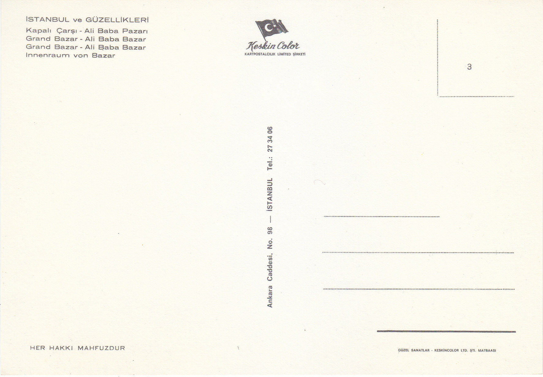 POSTCARD #118 Grand Bazar. Ali Baba Bazar. Istanbul [Turkey]. 3. Her Hakki Mahfuzour. Keskin Color. Kartpostalcilik Limited Şirkiti. 49. Ankara Caddesi, No. 98, Istanbul Tel.: 27 34 06. Güzel Sanatlar. Keskin Color Ltd. Şti. Matabaasi. 6" x 4" EXC