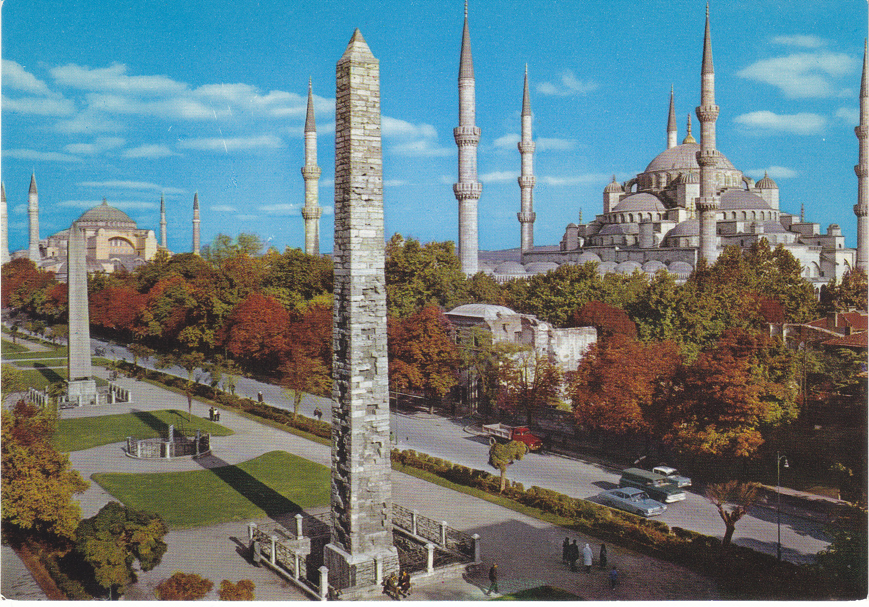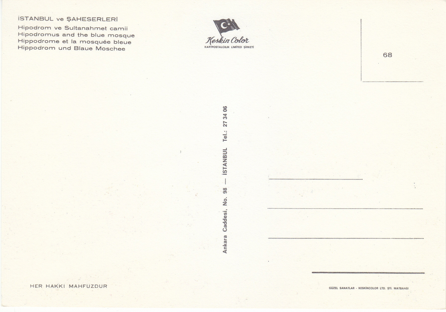 POSTCARD #121 Hippodrome and the Blue Mosque, Istanbul [Turkey]. Her Hakki Mahfuzour. Keskin Color. Kartpostalcilik Limited Sirkiti. 68. Ankara Caddesi, No. 98, Istanbul Tel.: 27 34 06. Guzel Sanatlar. Keskin Color Ltd. Sti. Matabaasi. 6" x 4" EXC