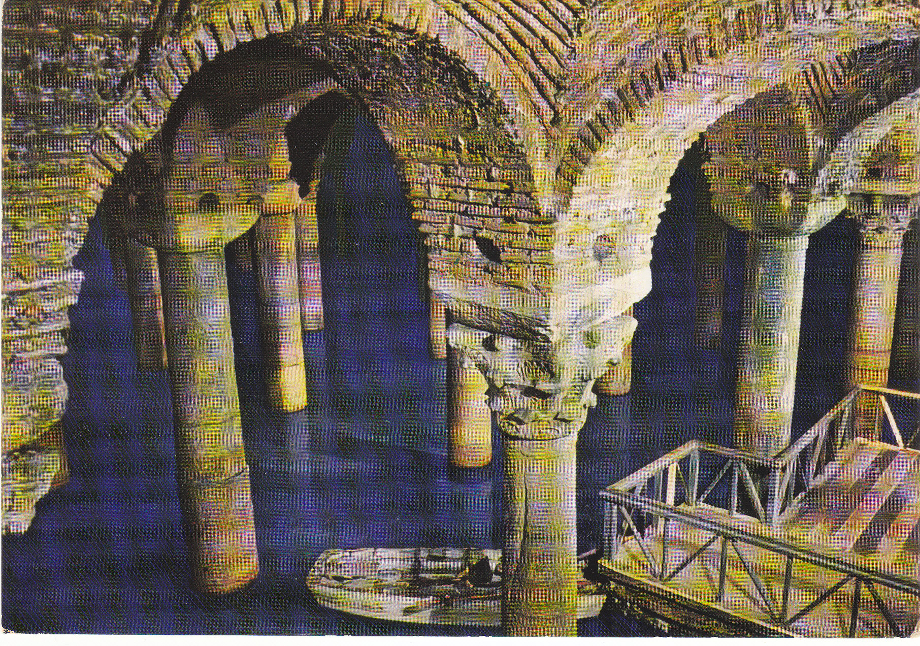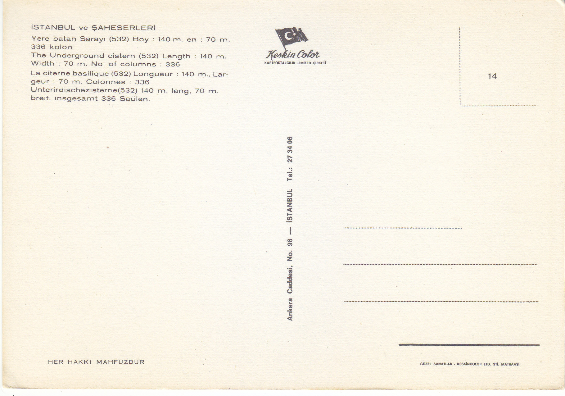 POSTCARD #122 The Underground Cistern, Istanbul [Turkey]. Length: 140m. Width: 70m. No. of columns: 336. Her Hakki Mahfuzour. Keskin Color. Kartpostalcilik Limited Sirkiti. 532. 14. Ankara Caddesi, No. 98, Istanbul Tel.: 27 34 06. Guzel Sanatlar. Keskin Color Ltd. Sti. Matabaasi. 6" x 4" EXC
