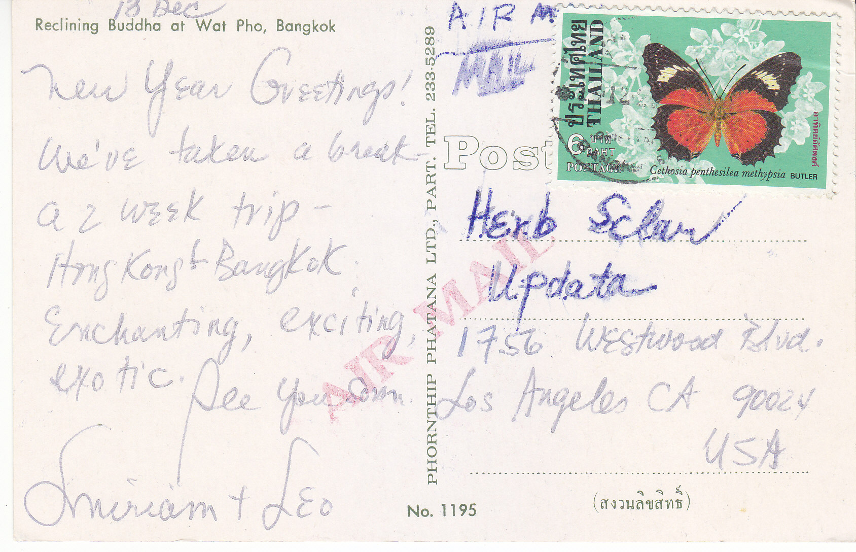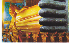POSTCARD #152 Reclining Buddha at Wat Pho, Bangkok [Thailand]. No. 1195. Phornthip Phatana Ltd., Part. Tel. 233-5289. 5.5" x 3.5" VG