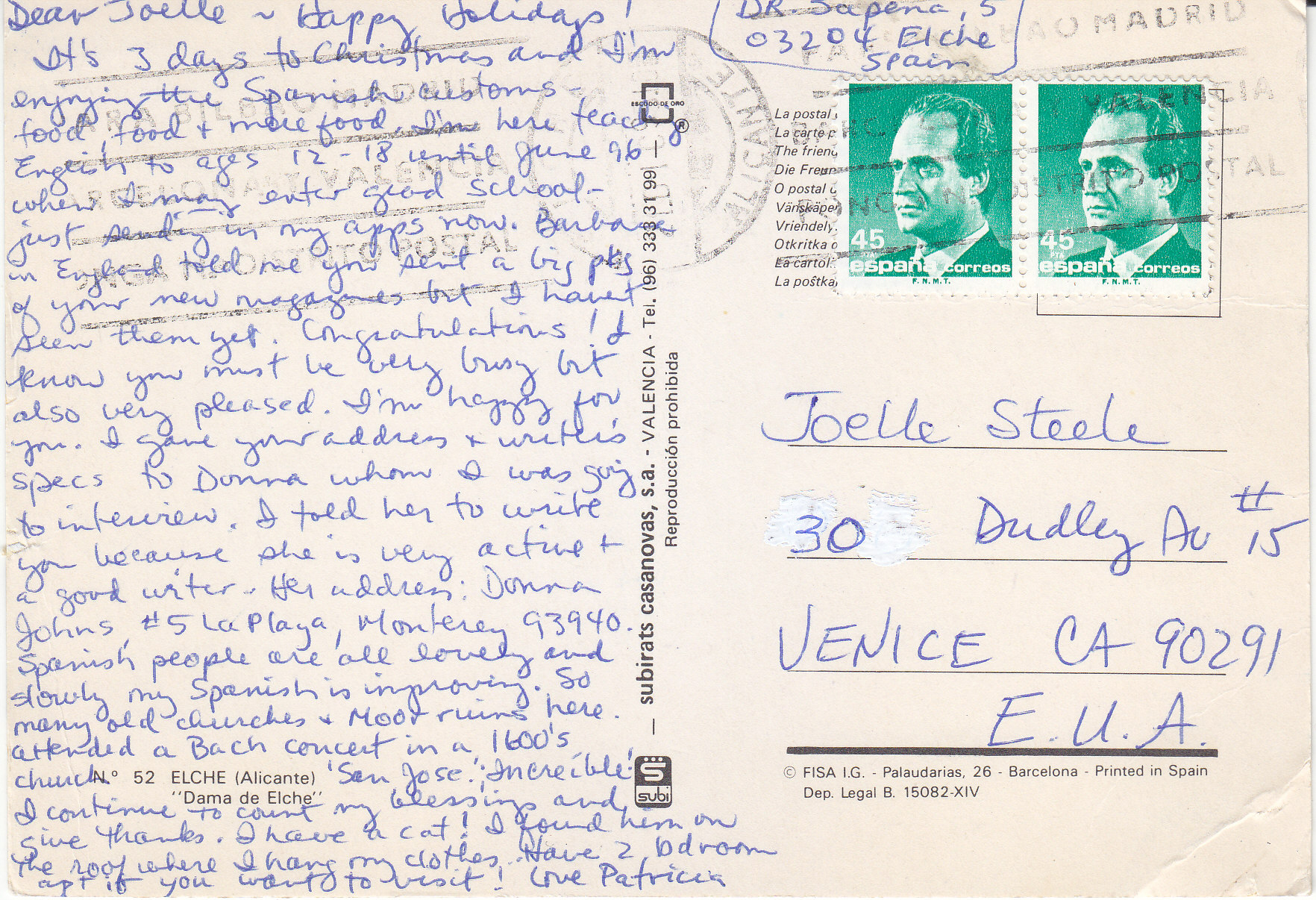 POSTCARD #163 Elche [Alicante]. Dama de Elche [Lady of Eiche] [Madrid, Spain]. 52. FISA I.G. Palaudarias 26, Barcelona [Spain]. Subirats Casanovas, S.A., Valencia [Spain] Tel. (96) 333 31 99. Dep. Legal B. 15082-XIV. Printed in Spain. Reproducción prohibida. 5.75" x 4" GD