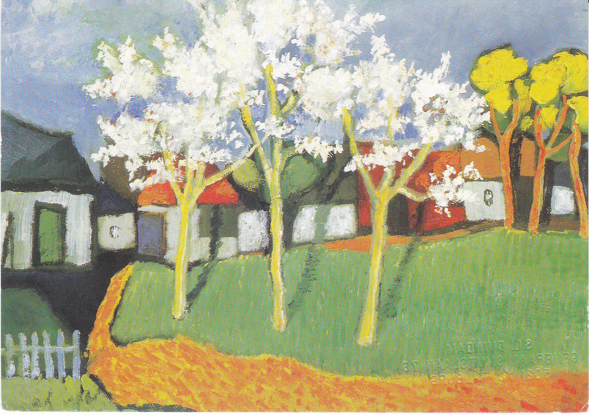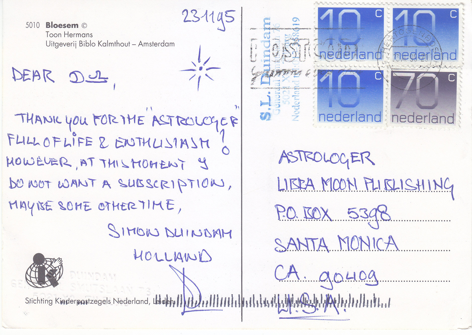 POSTCARD #165 Bloesem [Blossoms]. 5010. Copyright Toon Hermans. Uitgeverij Biblo Kalmthout, Amsterdam [Netherlands]. Stichting Kinderpostzegels Netherland, Leiden. Also has embossed printing in Dutch. 6.25" x 4.25" VG