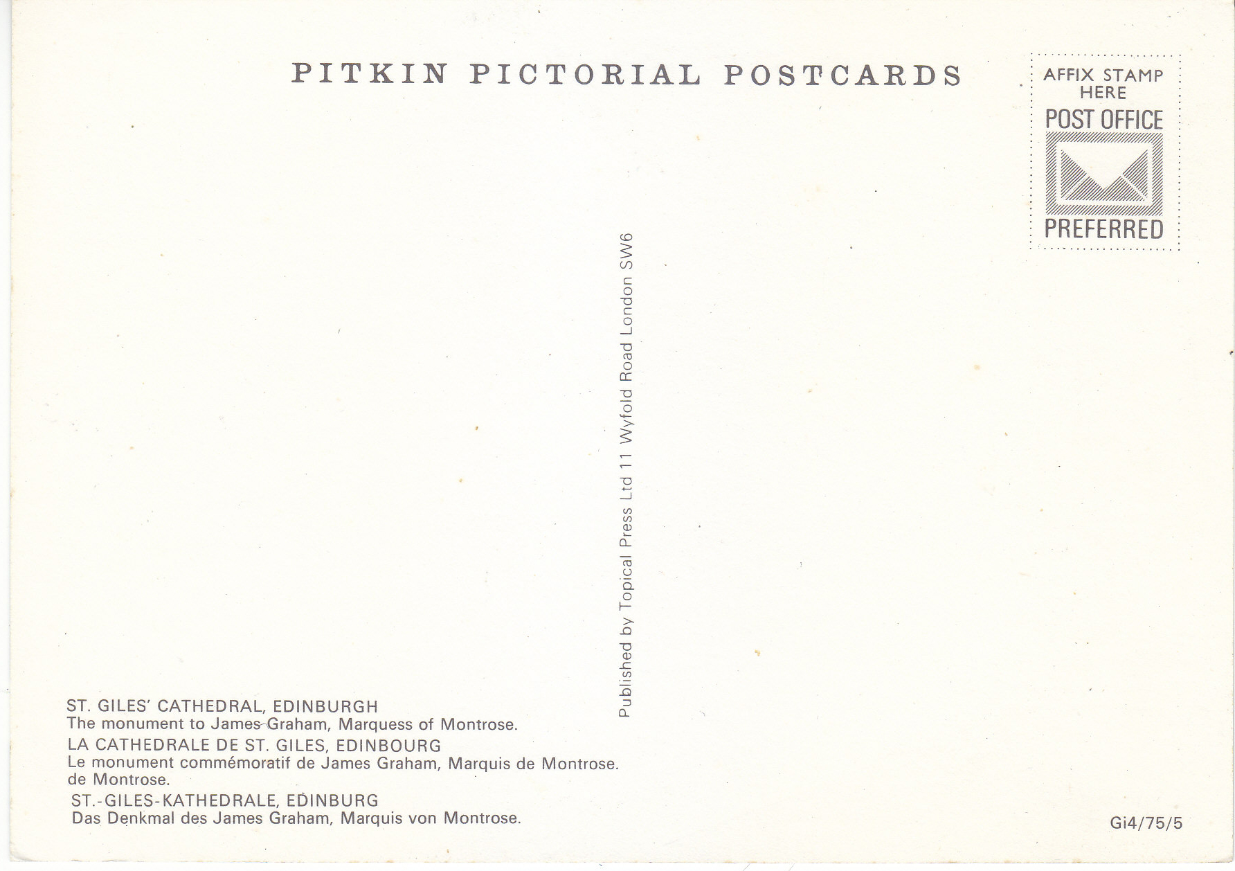 POSTCARD #181 St. Giles' Cathedral, Edinburgh [Scotland]. The Monument to James-Graham, Marquess of Montrose. Pitkin Pictorial Postcards. Gi4/75/5. Published by Topical Press Ltd., 11 Wyfold Road, London SW6 [England]. 6" x 4" EXC