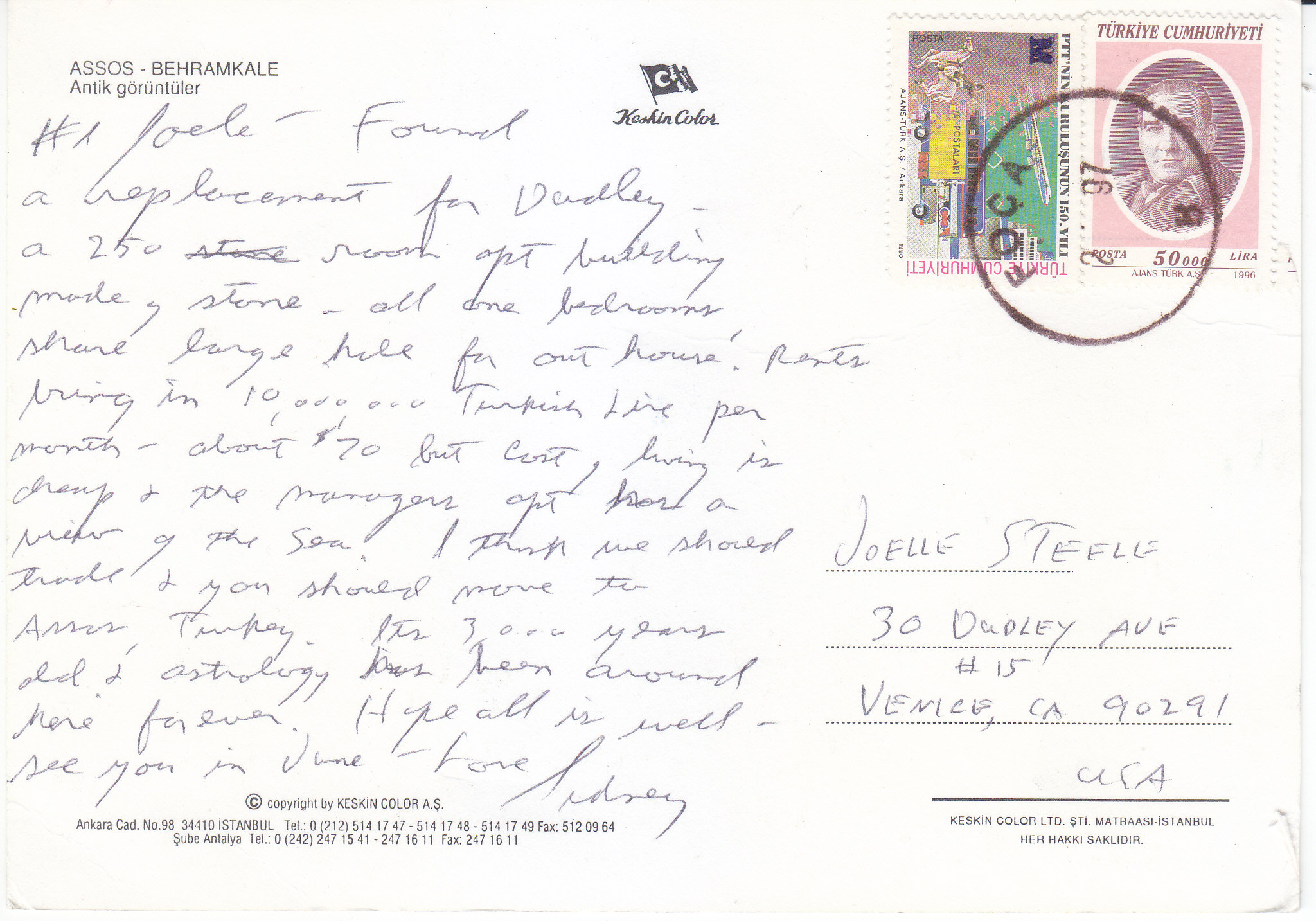 POSTCARD #183 Antik görüntüler [Ancient images]. Assos-Behramkale [Turkey]. Keskin Color. Copyright by Keskin Color A.S.. Ankara Cad. No. 98 34110 Istanbul Tel.: 0(212)514 17 47 - 514 17 48 - 514 17 49 Fax: 512 09 64. Keskin Color Ltd., STI. Matbaasi-Istanbul. Her Hakki Saklidir. 6.75" x 4.75" VG