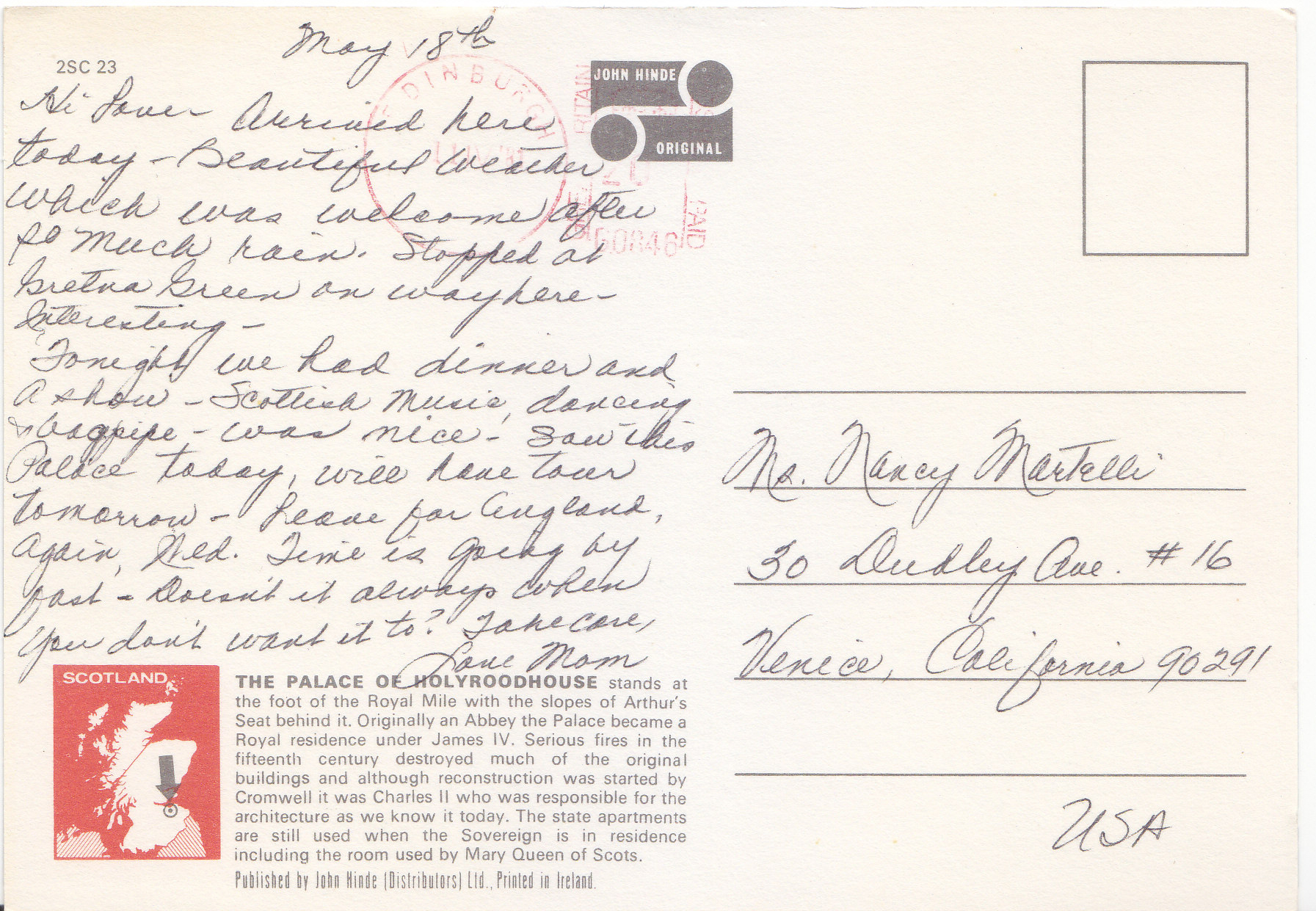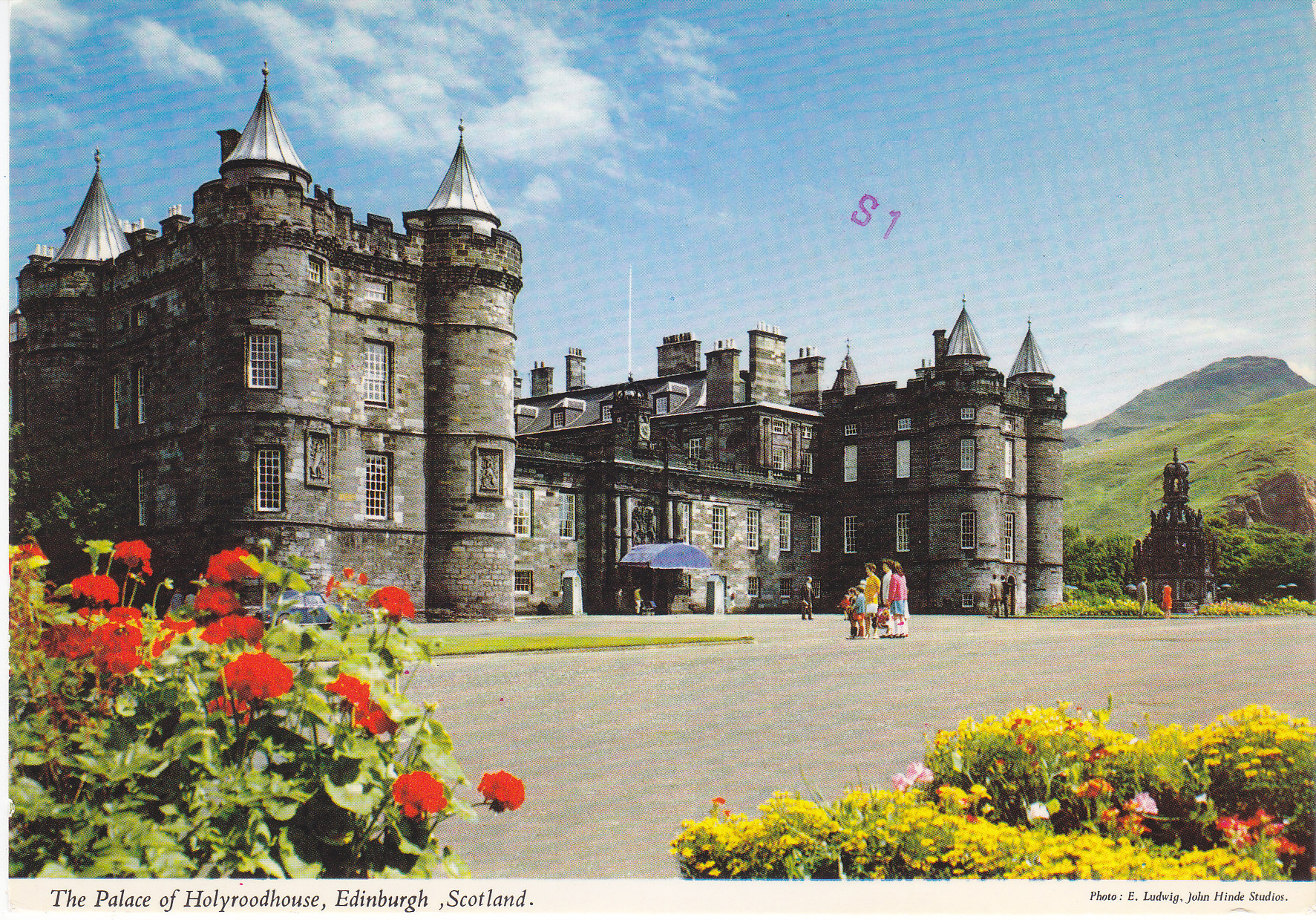 POSTCARD #243 Palace of Holyroodhouse, Edinburgh, Scotland. 25C-23. Photo: E. Ludwig, John Hinde Studios. John Hinde Original.The Palace of Holyroodhouse stands at the foot of the Royal Mile with the slopes of Arthur's Seat behind it. Originally an Abbey the Palace became a Royal residence under James IV. Serious fires in the fifteenth century destroyed much of the original buildings and although reconstruction was started by Cromwell it was Charles II who was responsible for the architecture as we know it today. The state apartments are still used when the Sovereign is in residence including the room used by Mary Queen of Scots. Published by John Hinde (Distributors) Ltd. Printed in Ireland. 6" x 4.25" VG