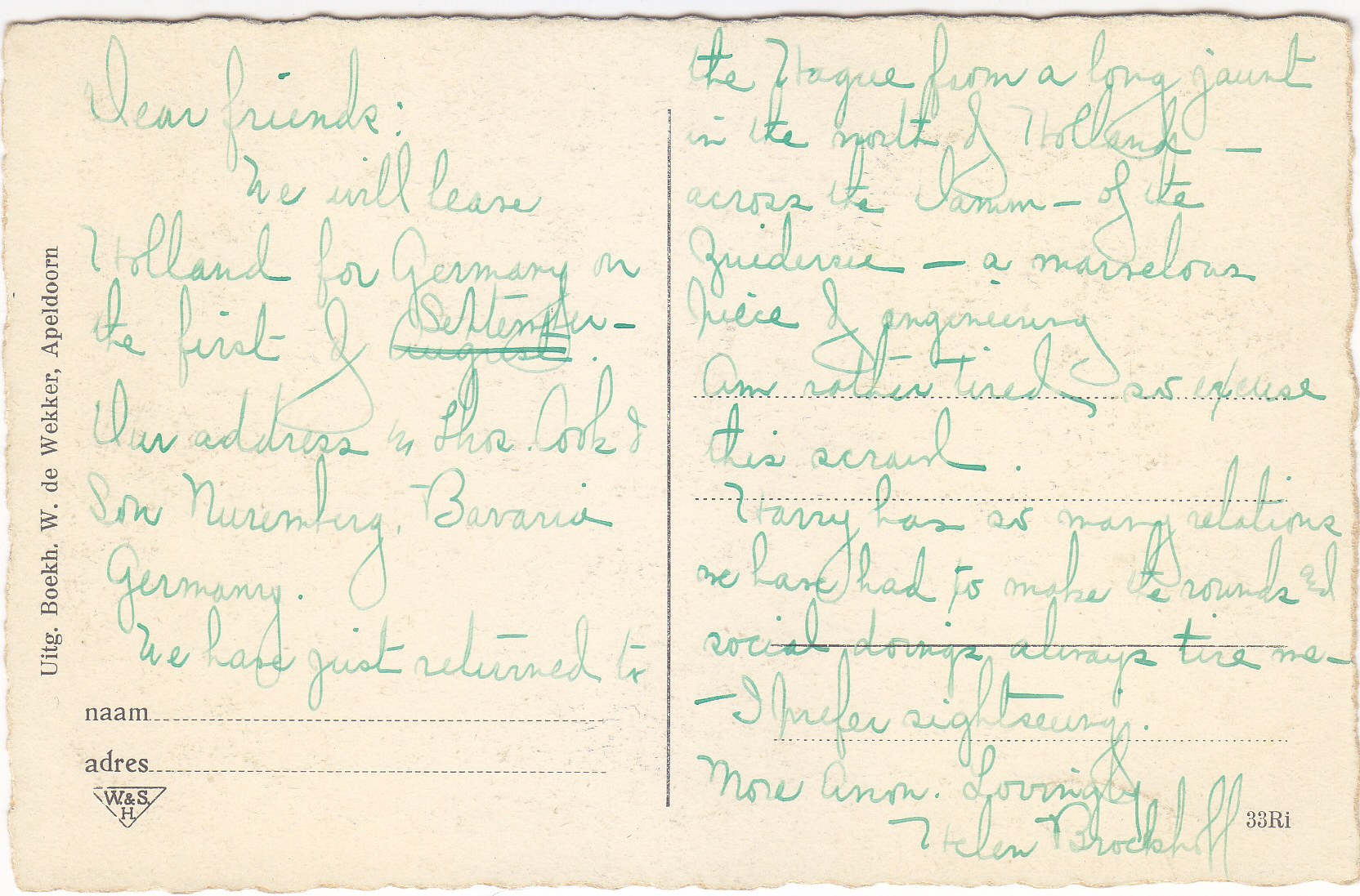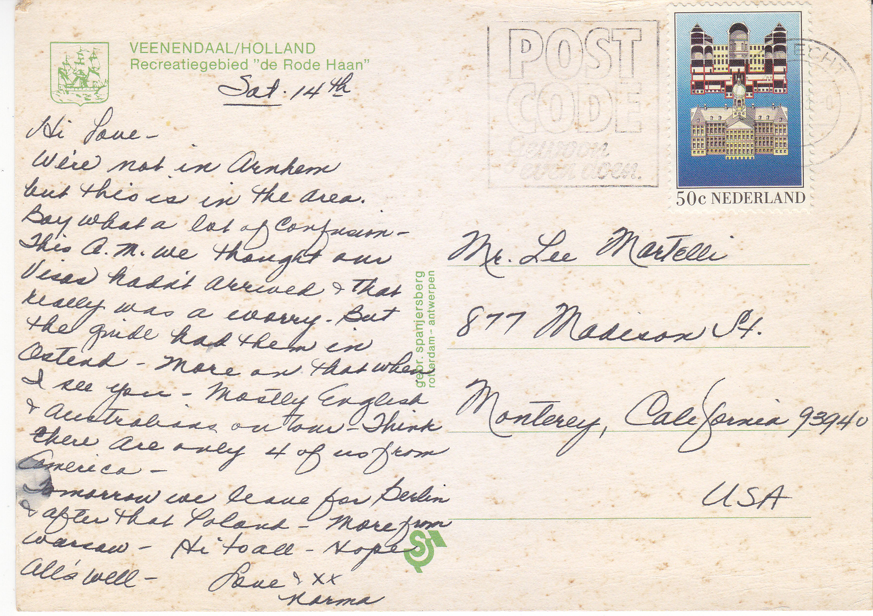 POSTCARD #244 Groeten uit Veenendaal [Greetings from Veenendaal, Netherlands]. Veenendaal/Holland. Recreatiegebied "de Rode Haan." Geor. Spanjersberg, Rotterdam, Antwerpen. 5.75" x 4.25" VG