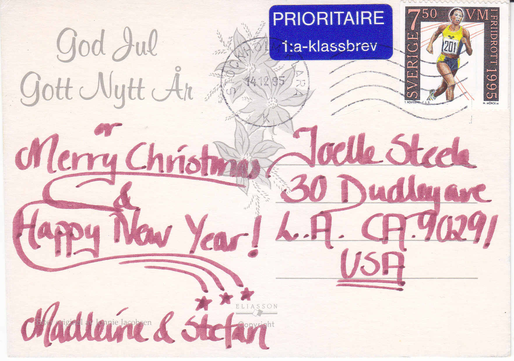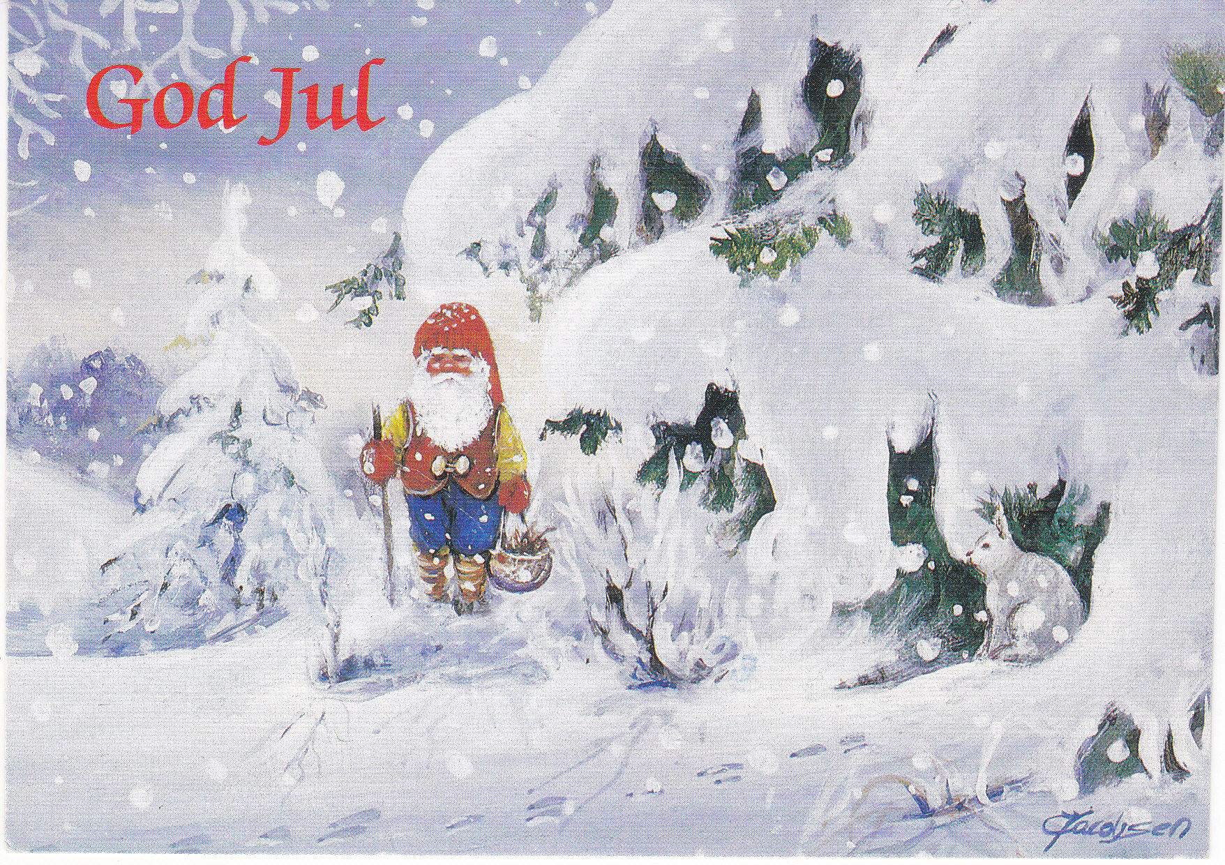 POSTCARD #267 God Jul, Gott Nytt År. [Merry Christmas, Happy New Year]. Artist: Jacobsen (signed). Efter original av Jonnie Jacobsen [After an original by Jonnie Jacobsen.] Eliasson Copyright. 5.75" x 4" EXC