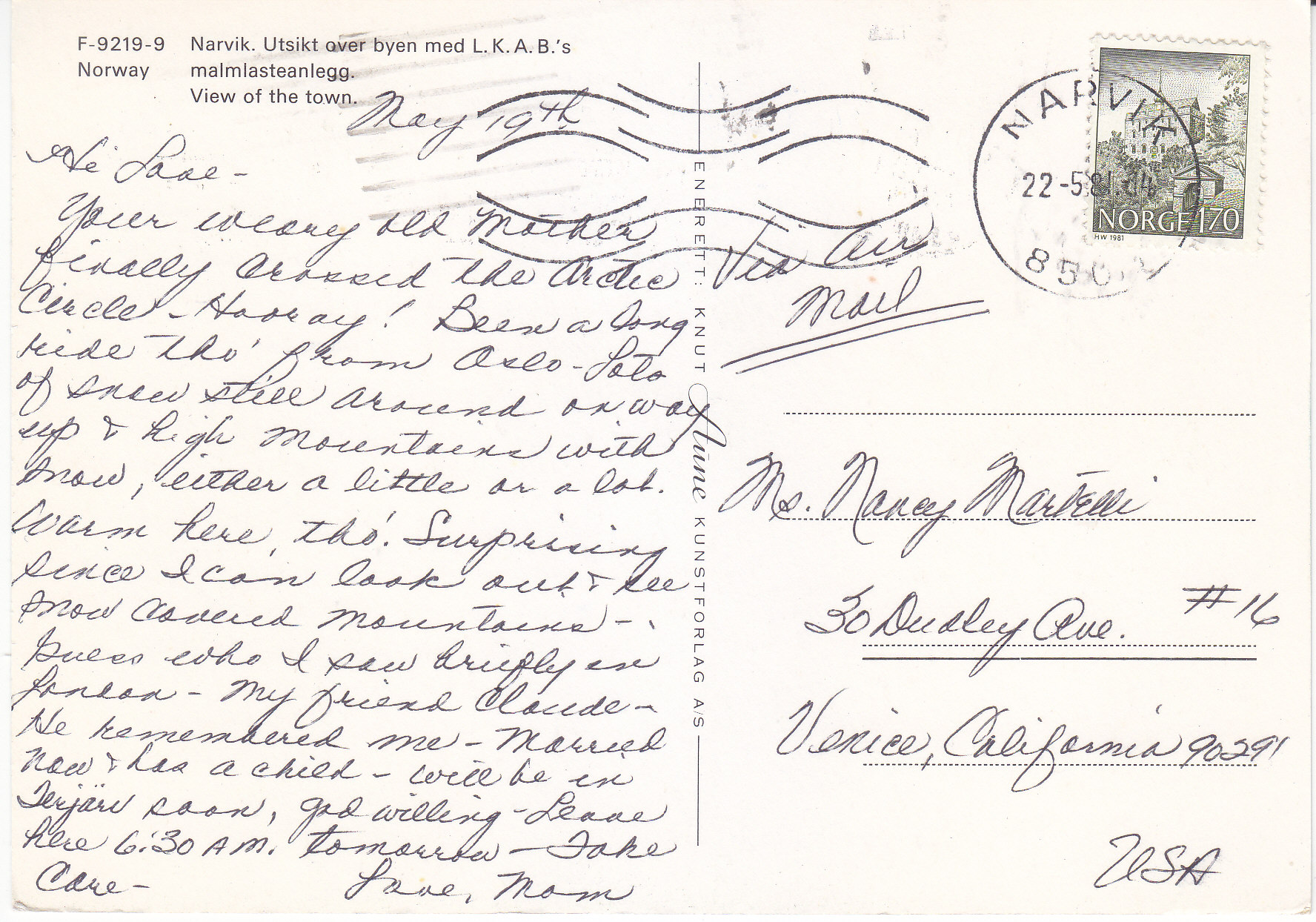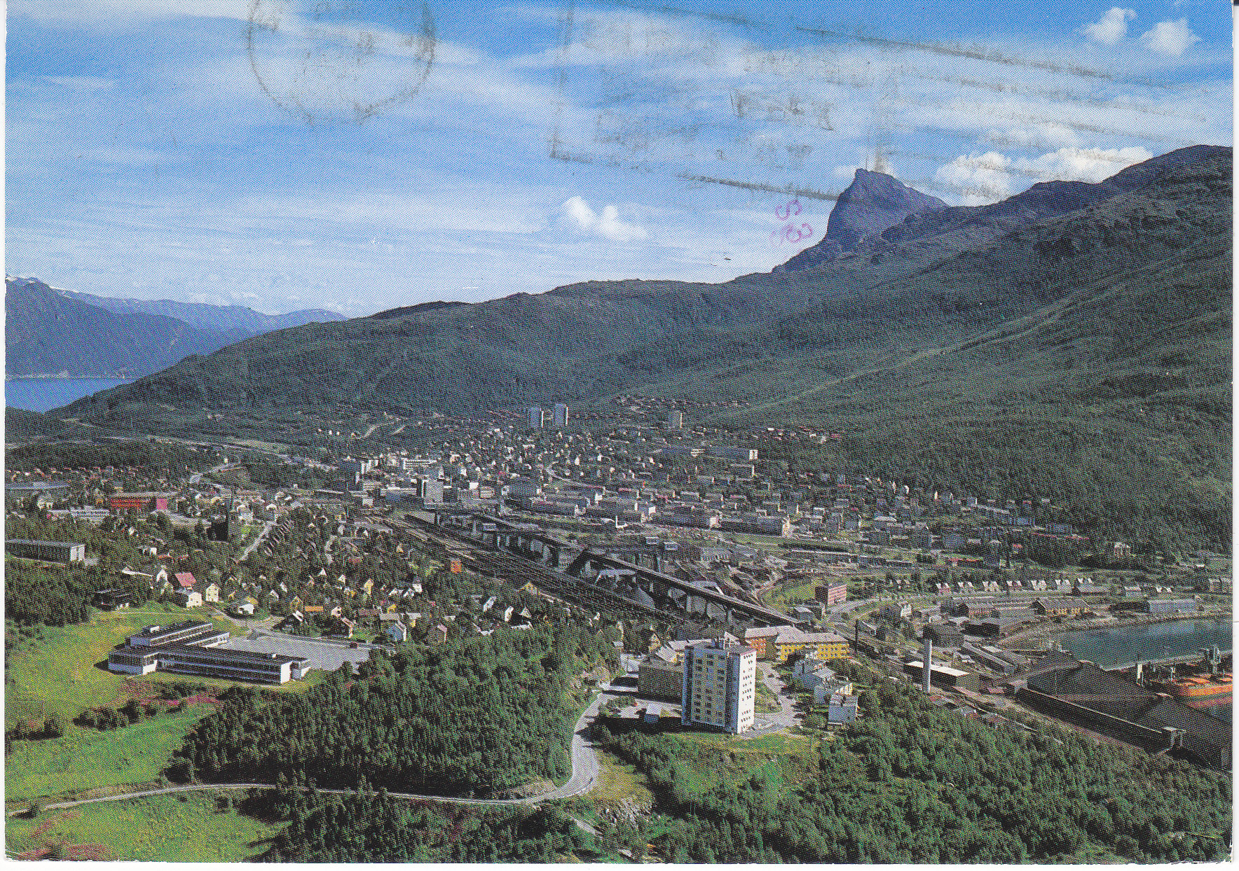 POSTCARD #272 Narvik [Norway]. F-9219-9. Utsikt over byen med L.K.A.B.'s malmlasteanlegg. [View of the town with L.K.A.B.'s ore loading facility]. Enerett: Knut Aune Kunstforlag A.S. Would be excellent if not for cancellation over the sky in the image. 5.75" x 4" FR