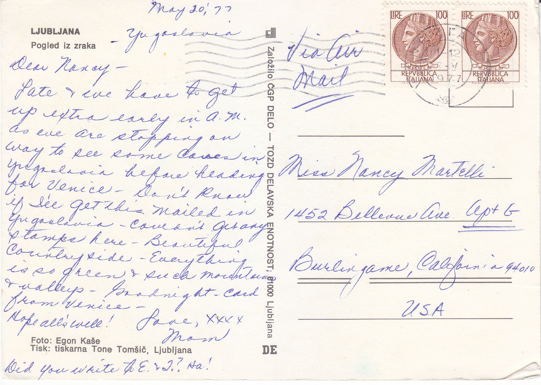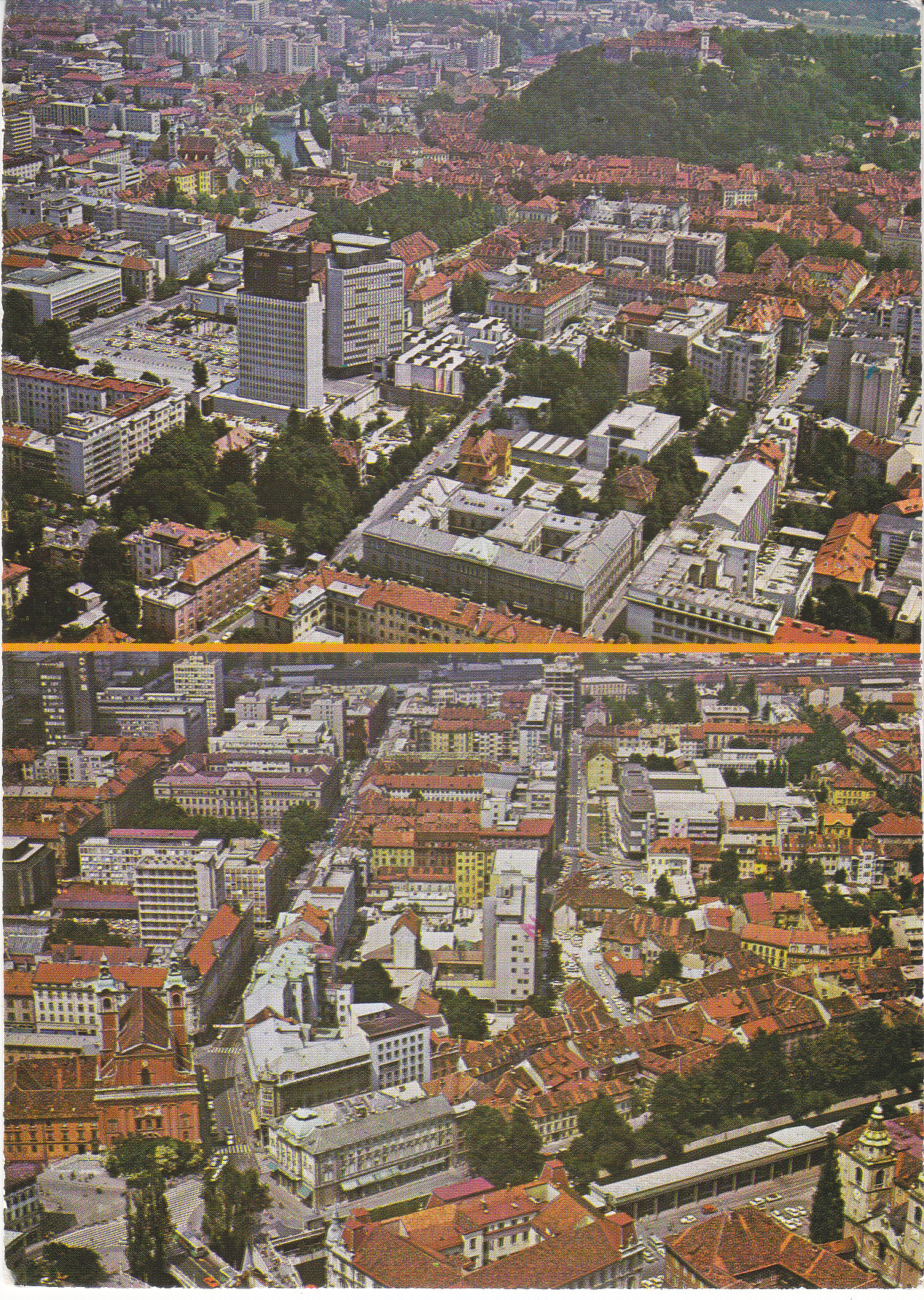 POSTCARD #276 Pogled iz zraka [Aerial View, Ljubljana, Yugoslavia]. DE. Foto: Egon Kaše. Tisk: tiskarna Tone Tomšič, Ljubljana.Založilo ČGP DELO - Tozd Delavska Enotnost; 61000 Ljubljana. 6" x 4.25" VG
