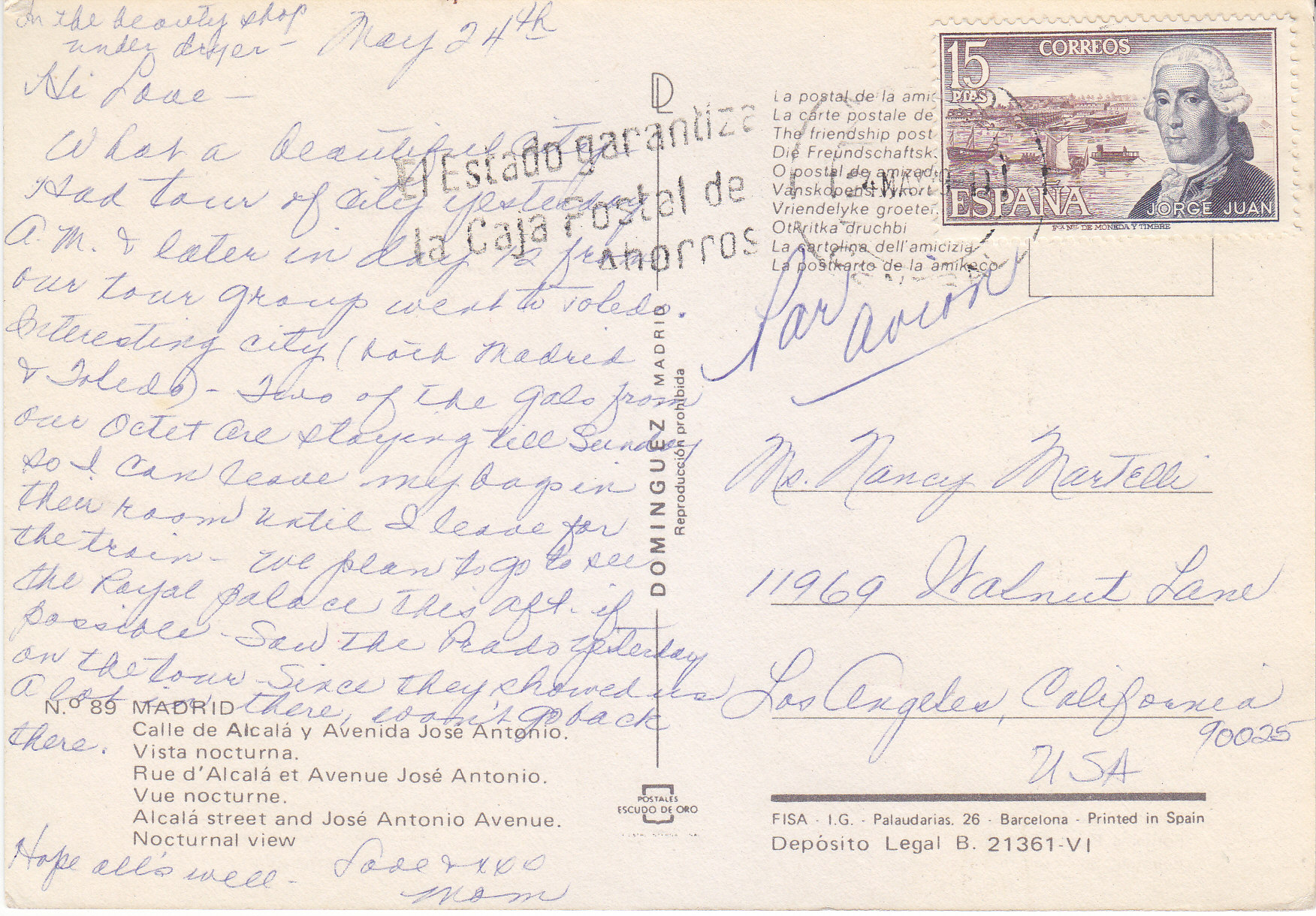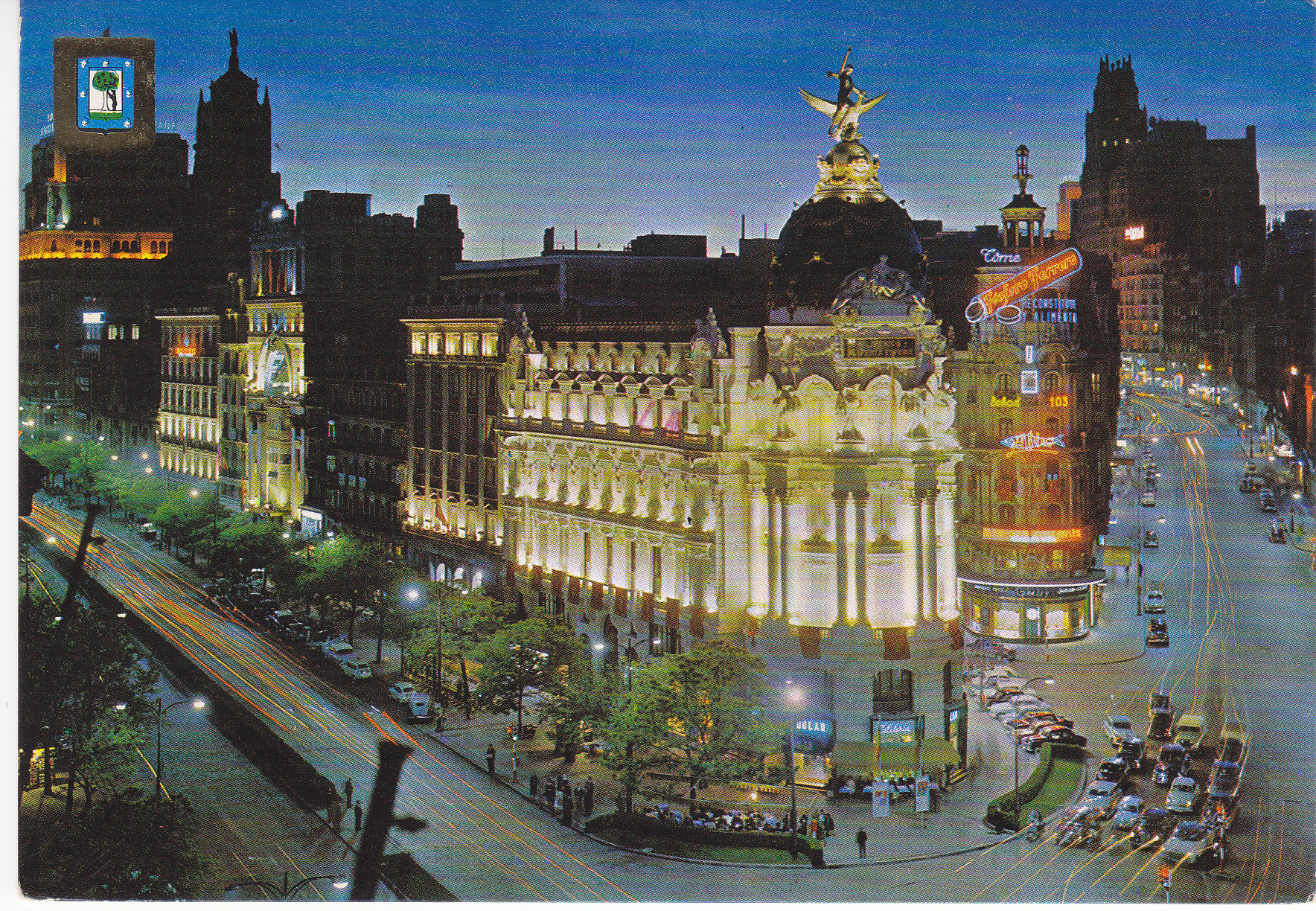POSTCARD #290 Alcalá Street and Jose Antonio Avenue by Night, Madrid [Spain]. N.° 89. Dominguez. Madrid. Reproducción prohibida. Postales Escudo de Oro. FISA I.G. Palaudarias 26, Barcelona. Printed in Spain. Depósito Legal B. 21361-VI. 5.75" x 4" VG