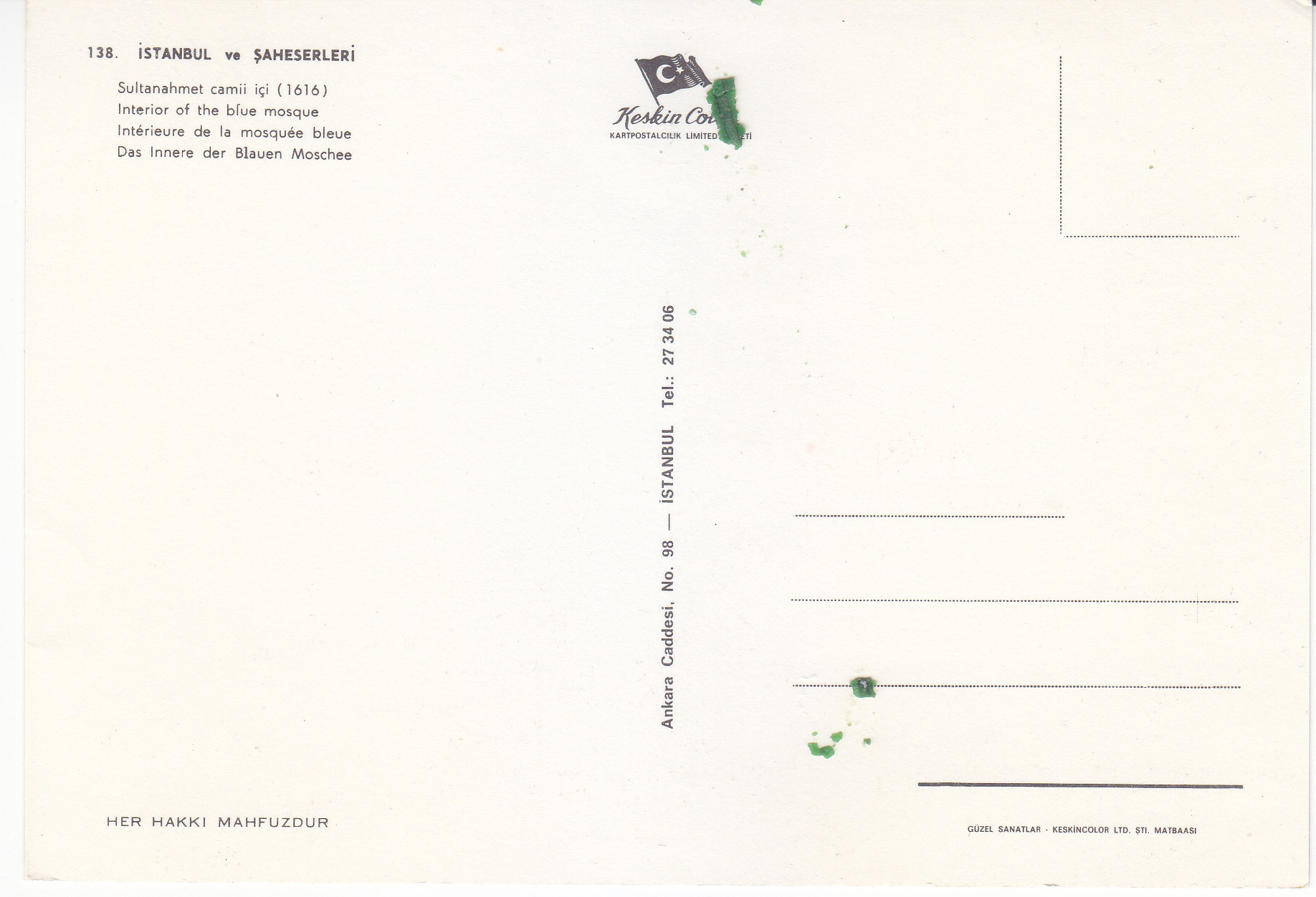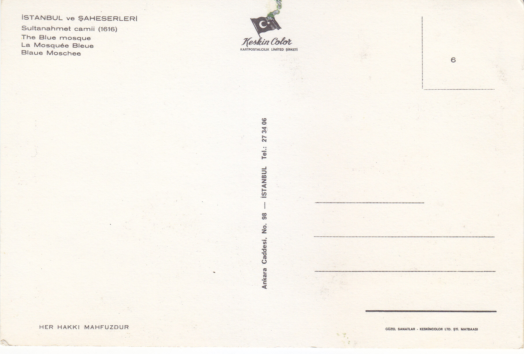 POSTCARD #325 The Blue Mosque, Istanbul ve Şaheserleri [Turkey]. Her Hakki Mahfuzour. Keskin Color. Kartpostalcilik Limited Şirkiti. 49. Ankara Caddesi, No. 98, Istanbul Tel.: 27 34 06. Güzel Sanatlar. Keskin Color Ltd. Şti. Matabaasi. 6" x 4" GD/VG
