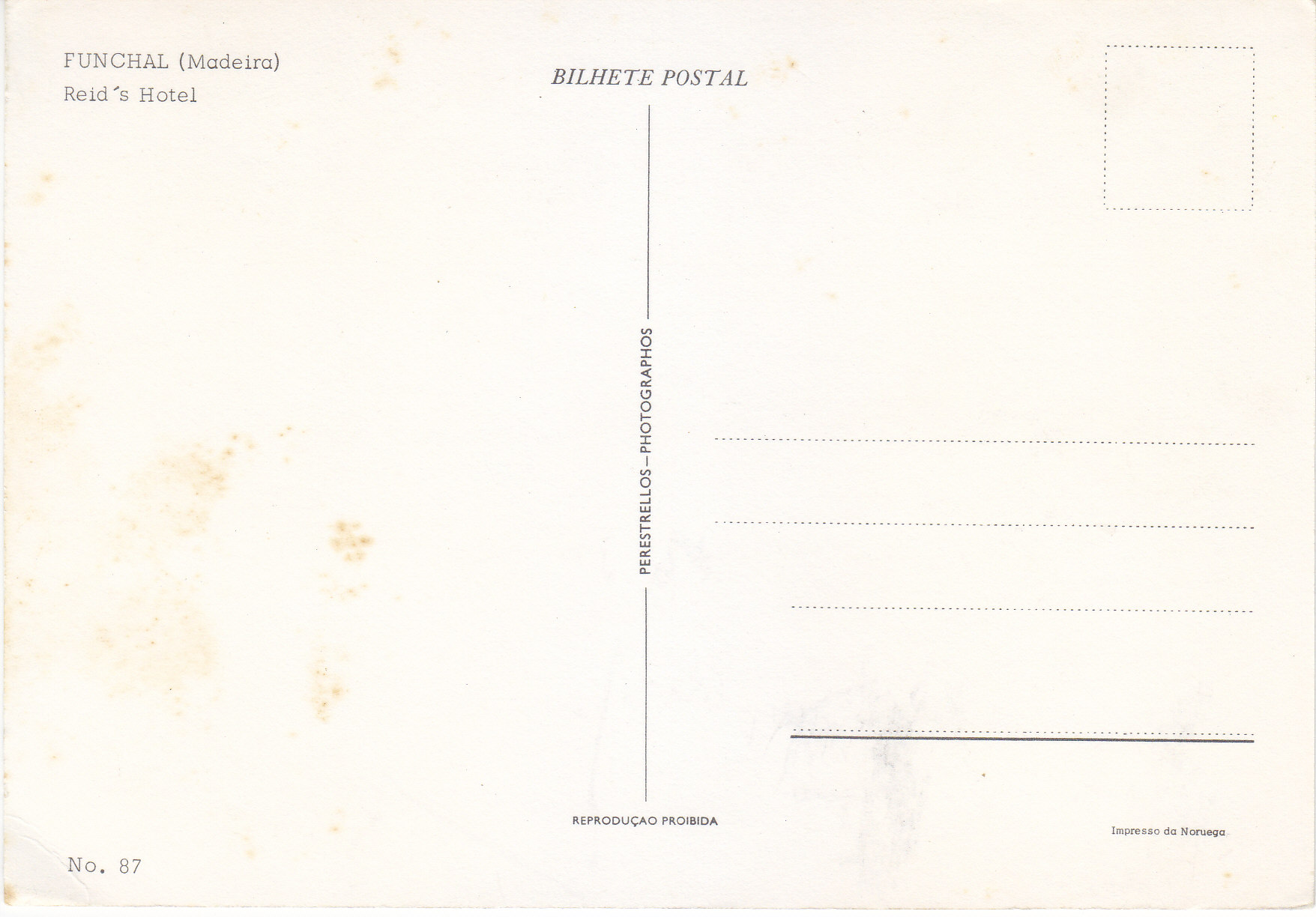 POSTCARD #359 Reid's Hotel, Funchal, Madeira [Madeira Island, Portugal]. NO. 87. Reprodução proibida. Bilhete Postal. Perestrellos Photographos. Impresso da Noruega. 5.75" x 4" GD