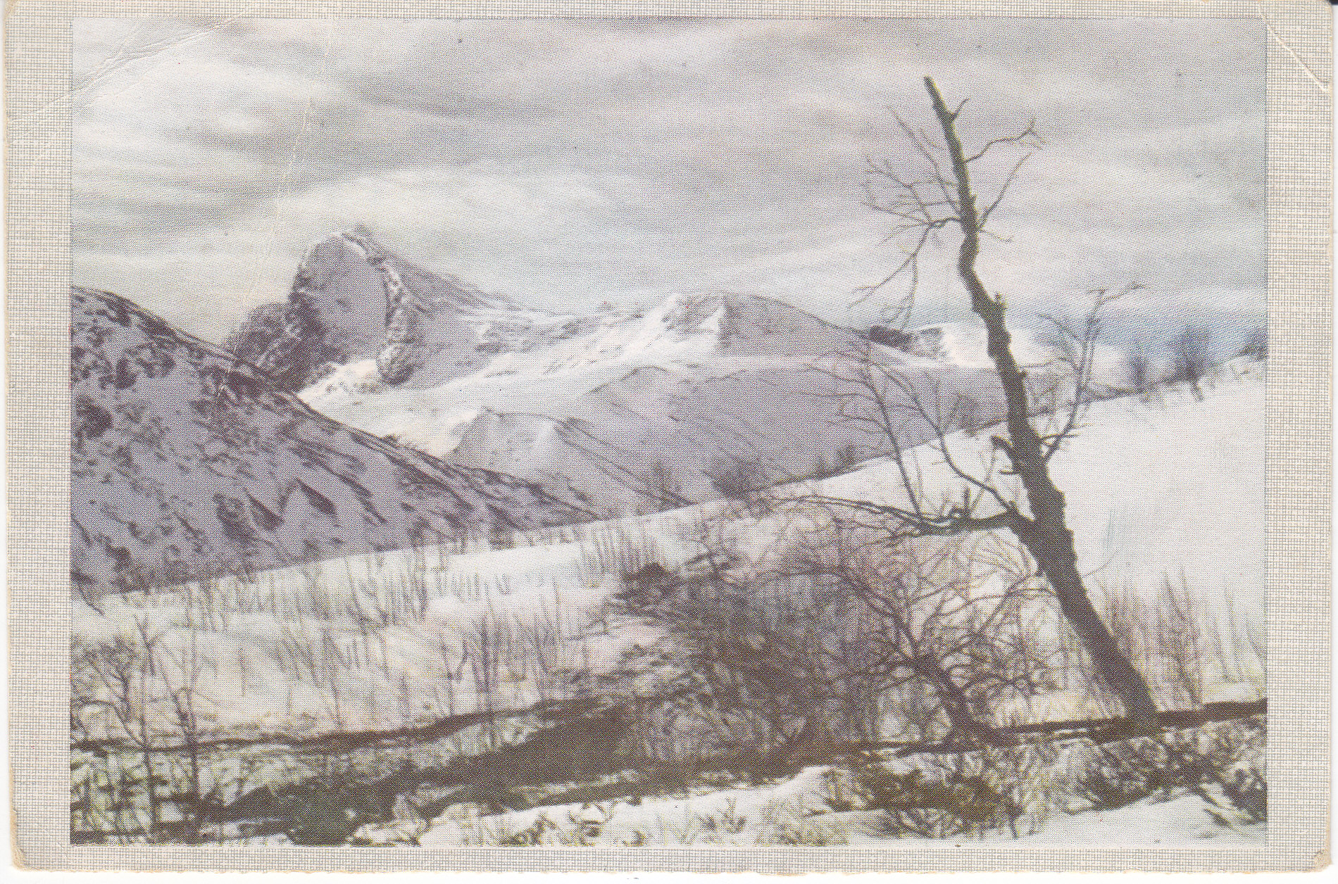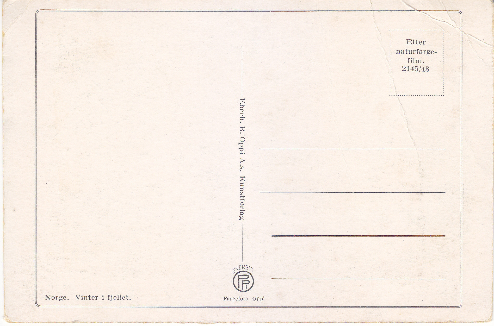 POSTCARD #364 Vinter i fjellet, Norge [Winter in the Mountains, Norway]. Enerett OPPI. Fargefoto Oppi. Etter naturfarge-film. 2145/48. Everh. B. Oppi A.S, Kunstforlag. Some light creasing, otherwise an excellent image. 6.25" x 4.25" VG