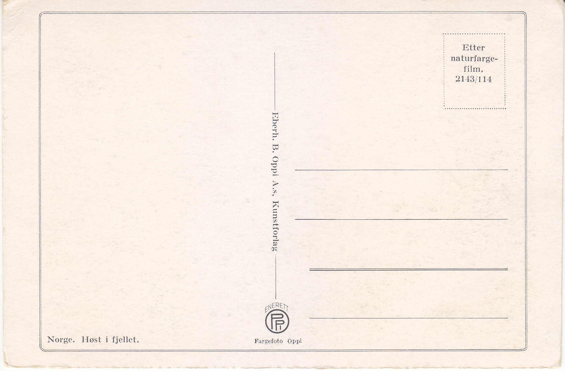 POSTCARD #365 Høst i fjellet, Norge [Autumn in the Mountains, Norway]. Enerett OPPI. Fargefoto Oppi. Etter naturfarge-film. 2143/114. Everh. B. Oppi A.S, Kunstforlag. 6.25" x 4.25" EXC