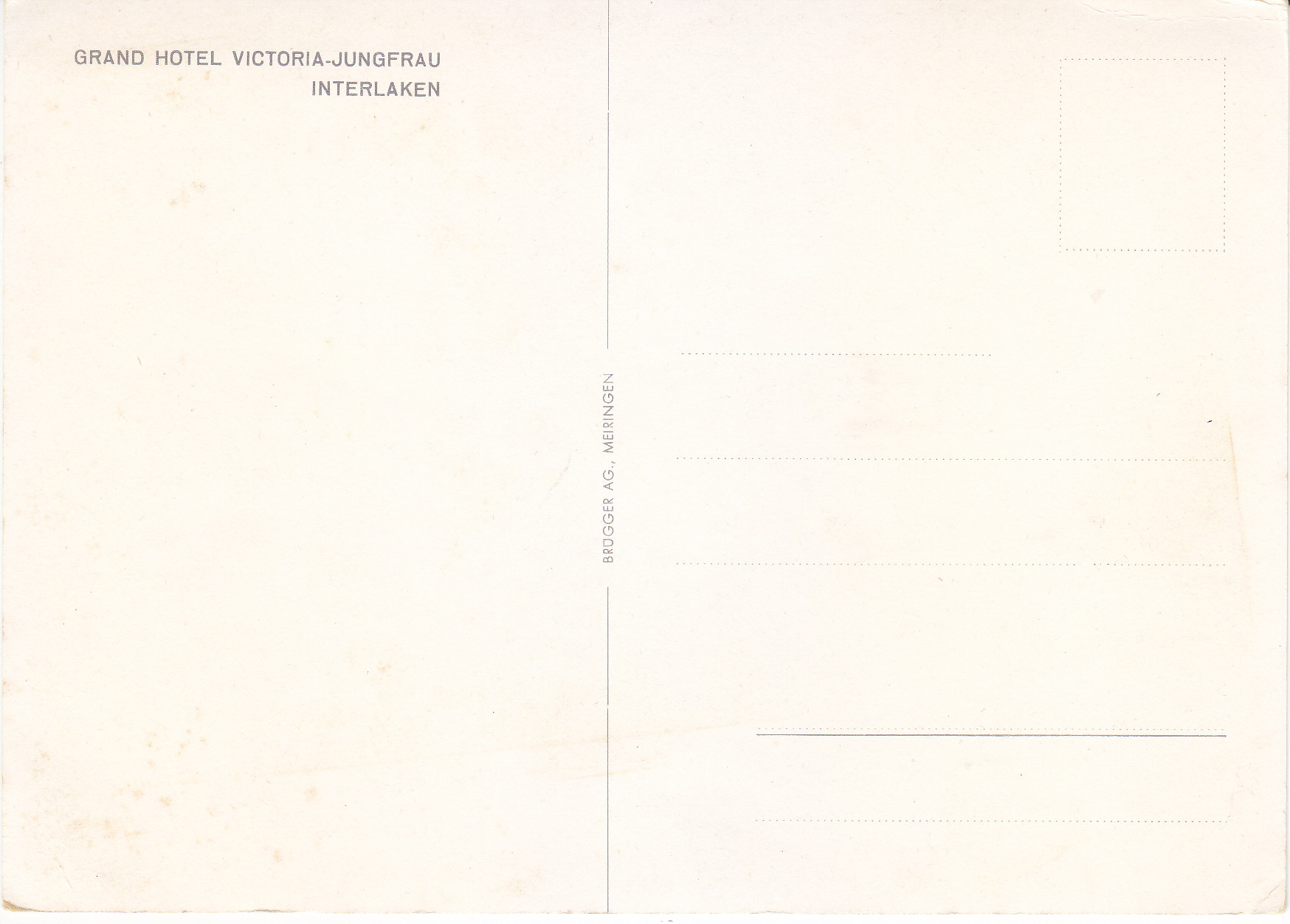 POSTCARD #374 Grand Hotel Victoria, Jungfrau, Interlaken [Switzerland]. Brügger ag., Meiringen. 4.25" x 5.75" VG