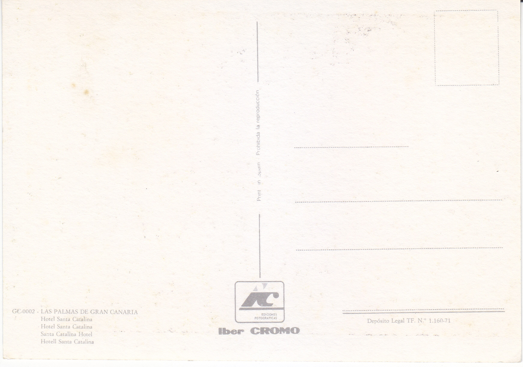 POSTCARD #375 Santa Catalina Hotel, Las Palmas de Gran Canaria, Canarias, España [Canary Islands, Spain]. Printed in Spain. Prohibita la Reproducción. Ediciones Fotografica. Iber Cromo. Depósito Legal TF No. 1.160-71. 5.75" x 4" EXC