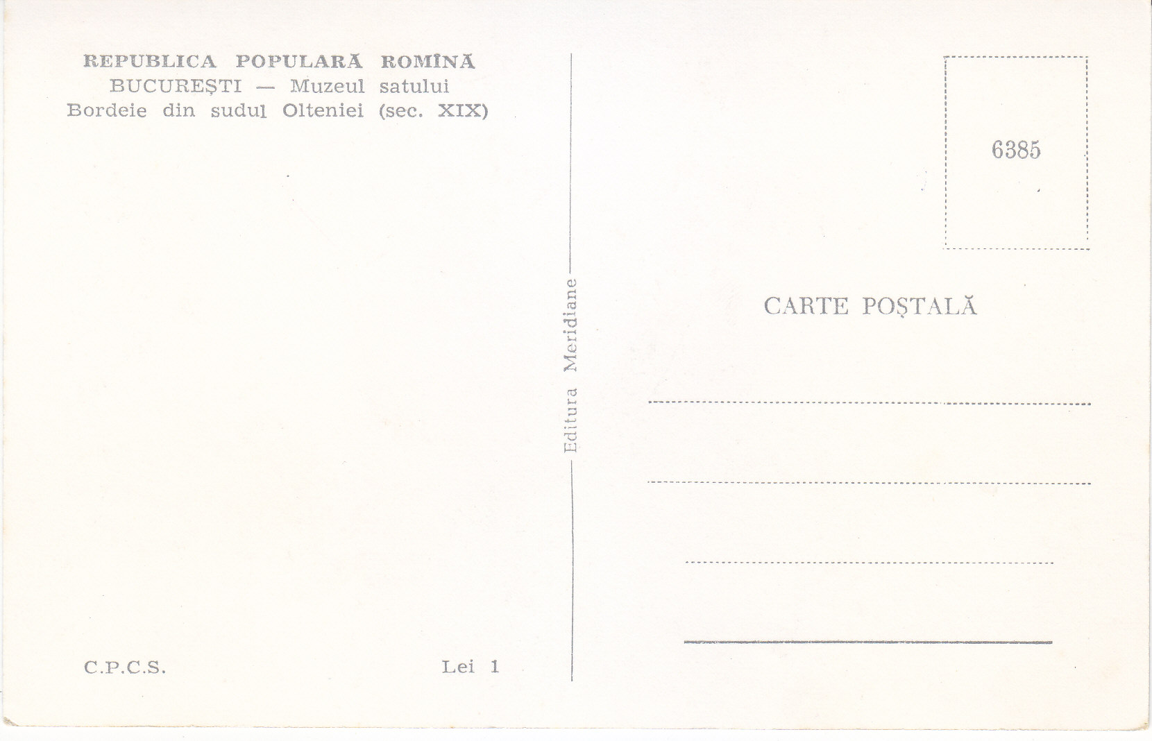 POSTCARD #379 Muzeul satului [Village Museum]. Bordele din sudul Olteniei (sec. XIX) [The huts in the south of Oltenia]. București [Bucharest], Republica Populară Romînă [People's Republic of Romana (Its name from 1954-1962)]. C.P.C.S. Lei 1. 6385. Editura Meridiane. 3.5" x 5.5" EXC