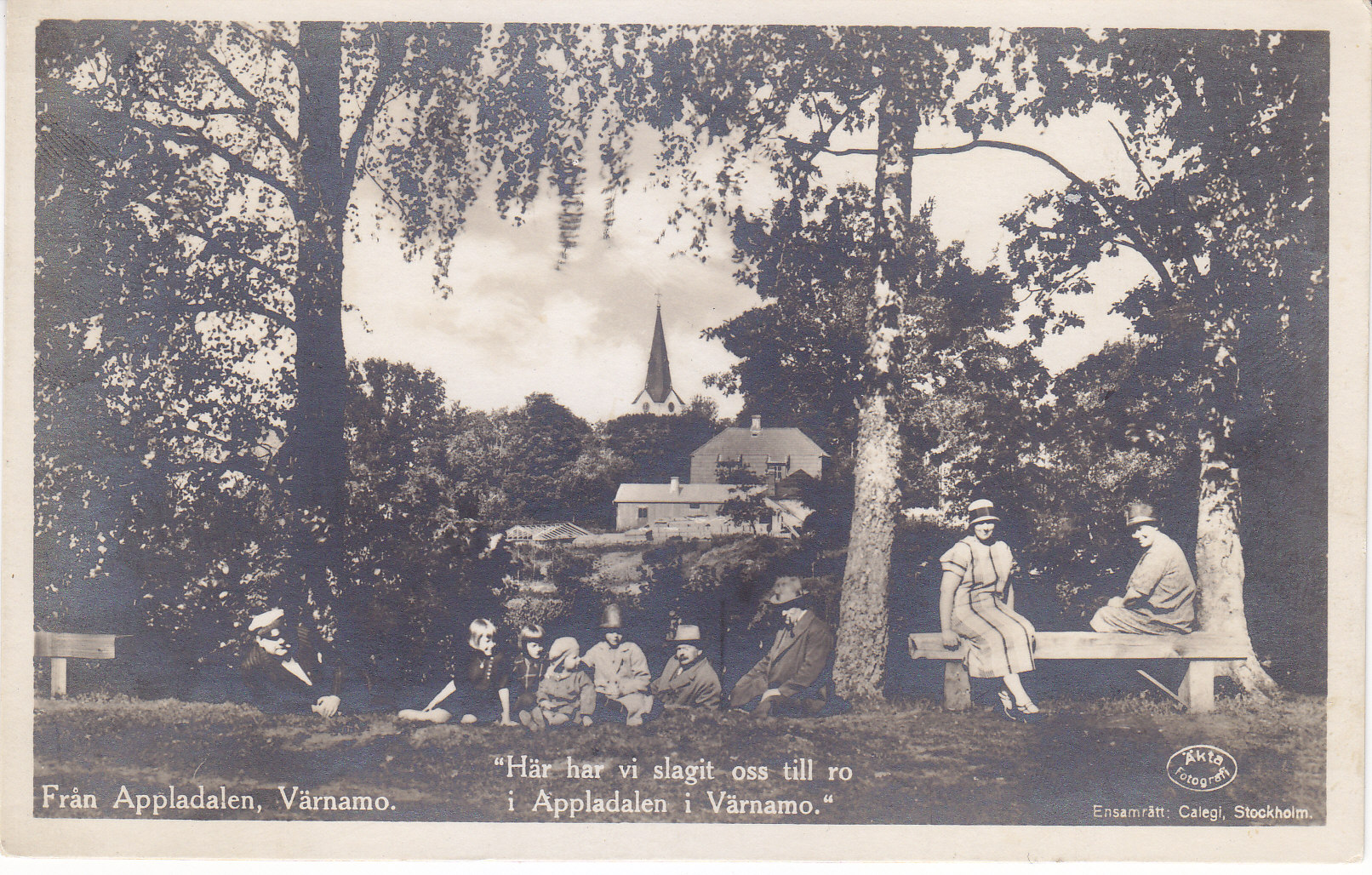 POSTCARD #431 Från Appladalen, Värnamo [Appladalen/Apladalen (Natural History Park), Värnamo, Sweden]. "Här har vi slagit oss till ro i Appladalen i Värnamo" ["Here we have settled in the Apladalen in Värnamo"]. Äkta Fotografi. Ensamrätt: Calegi, Stockholm. Förlag: Arvid Nilsson, Värnamo. No. 7113. Import. Calegi-Vykortslager. 5.5" x 3.5" EXC