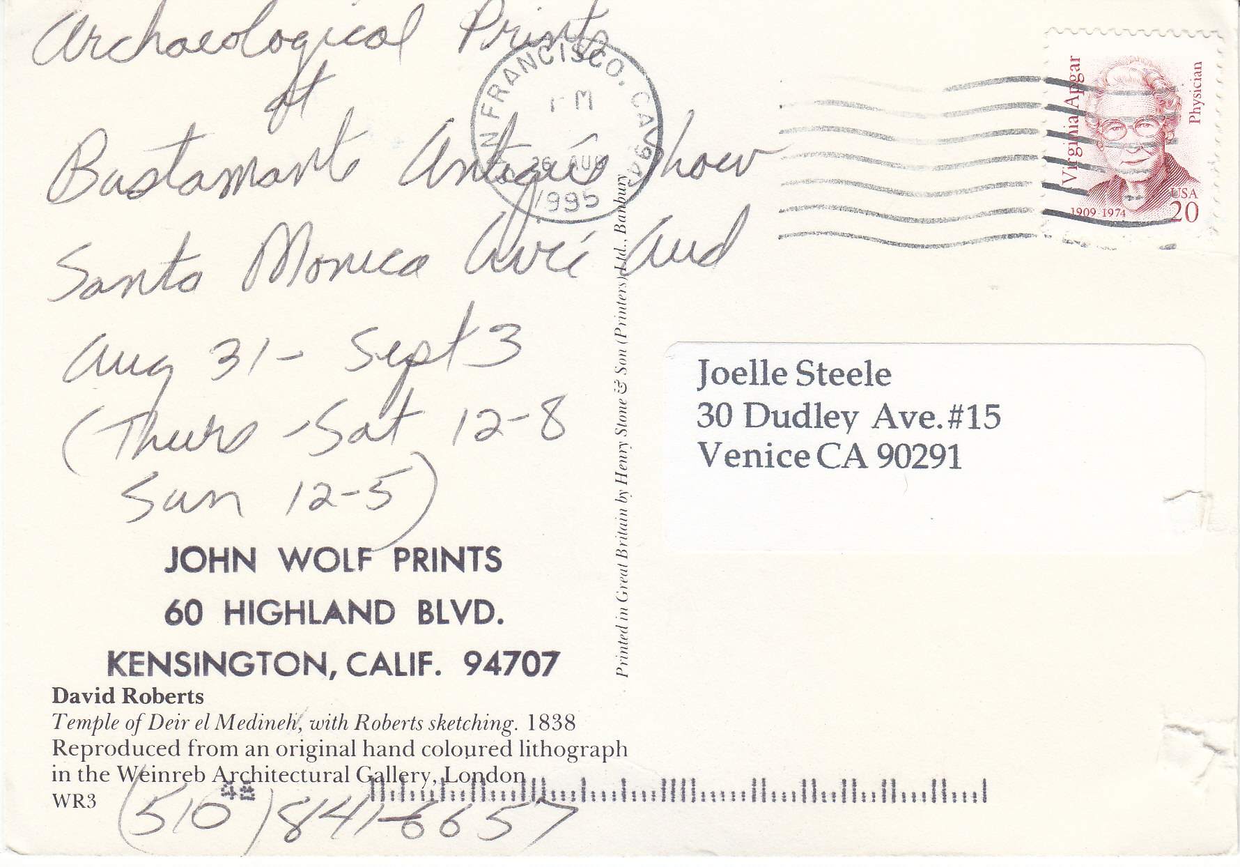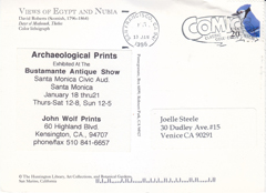 POSTCARD #186 Temple of Deir el Medineh in Thebes, 1838, from Views of Egypt and Nubia, by David Roberts (Scottish, 1796-1864), Copyright The Huntington Library, Art Collections, and Botanical Gardens, San Marino, California. Color Lithograph. Deckled edge on left of image due to being torn out of a booklet. 6.5" x 4.75" GD