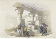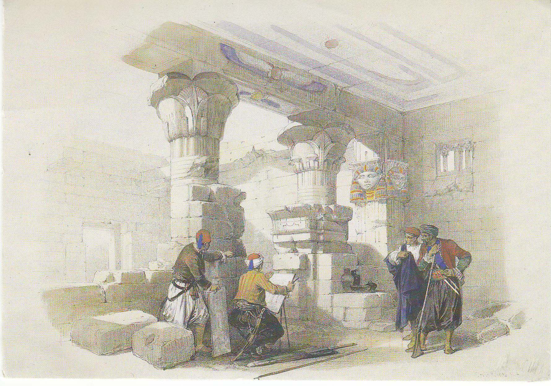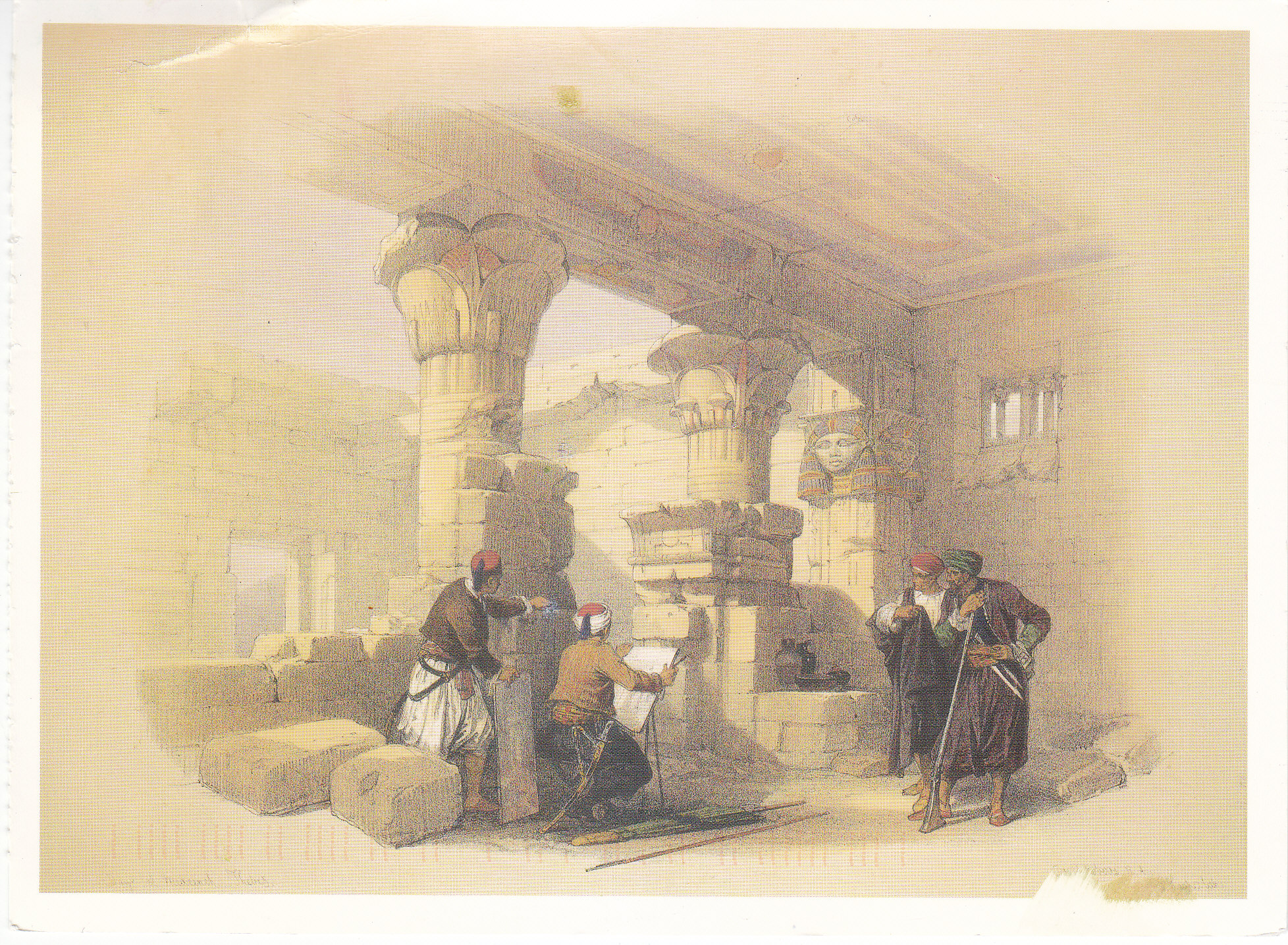 POSTCARD #048 Temple of Deir el Medineh in Thebes by David Roberts, 1838. Reproduced from an original hand-coloured lithograph in the Weinreb Architectural Gallery, London, WR3 [England]. 6" x 4" VG