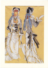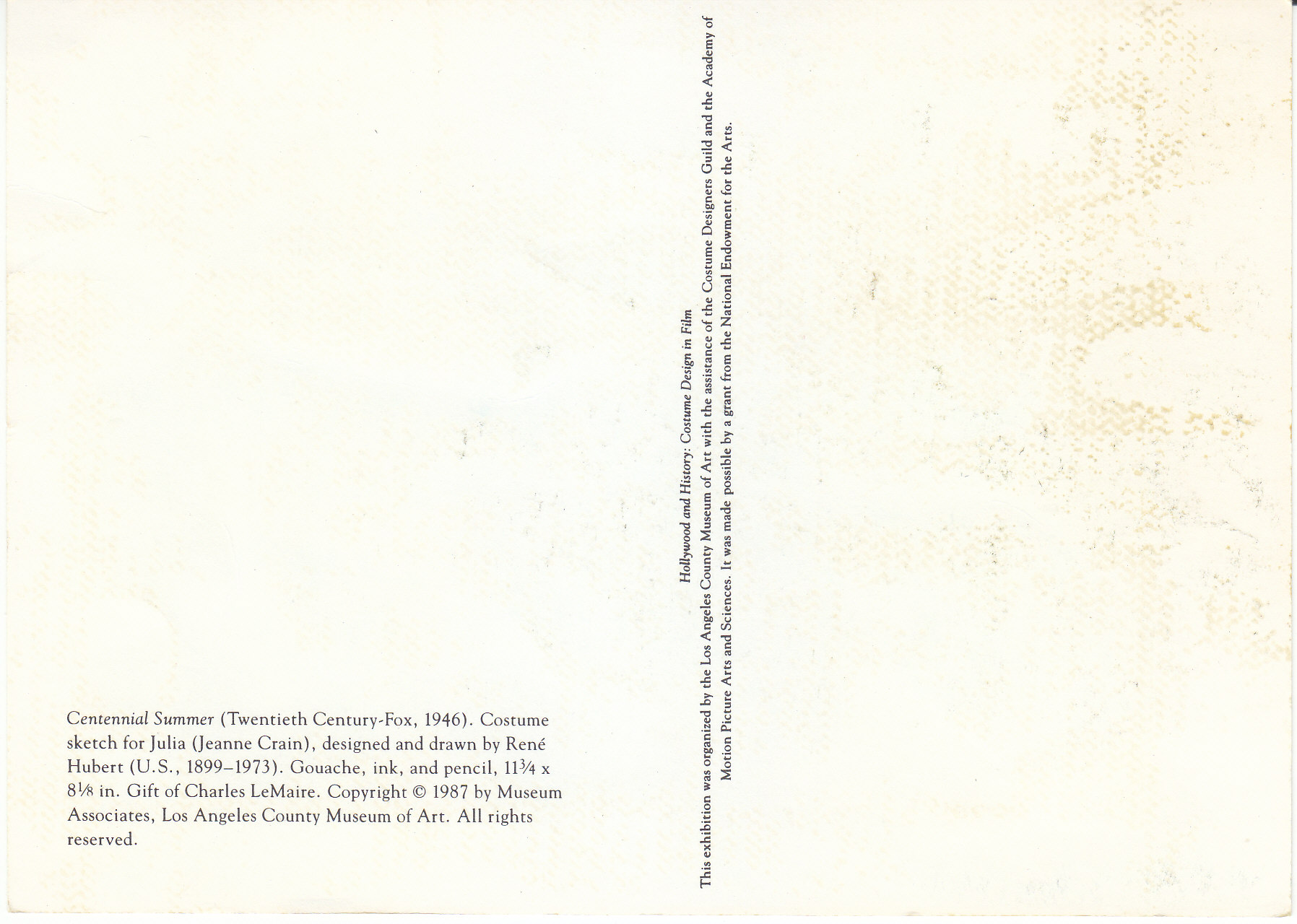 POSTCARD #052 Centennial Summer (Twentieth Century-Fox, 1946). Costume sketch for Julia (Jeanne Crain), designed and drawn by Rene Hubert (U.S., 1899-1973). Gouache, ink, and pencil, 11-3/4 x 8-1/8 in. Gift of Charles LeMaire. Copyright 1987 by Museum Associates, Los Angeles County Museum of Art. All rights reserved. Hollywood and History: Costume Design in Film. This exhibition was organized by the Los Angeles County Museum of Art with the assistance of the Costume Designers Guild and the Academy of Motion Picture Arts and Sciences. It was made possible by a grant from the National Endowment for the Arts. 4.25" x 6" EXC