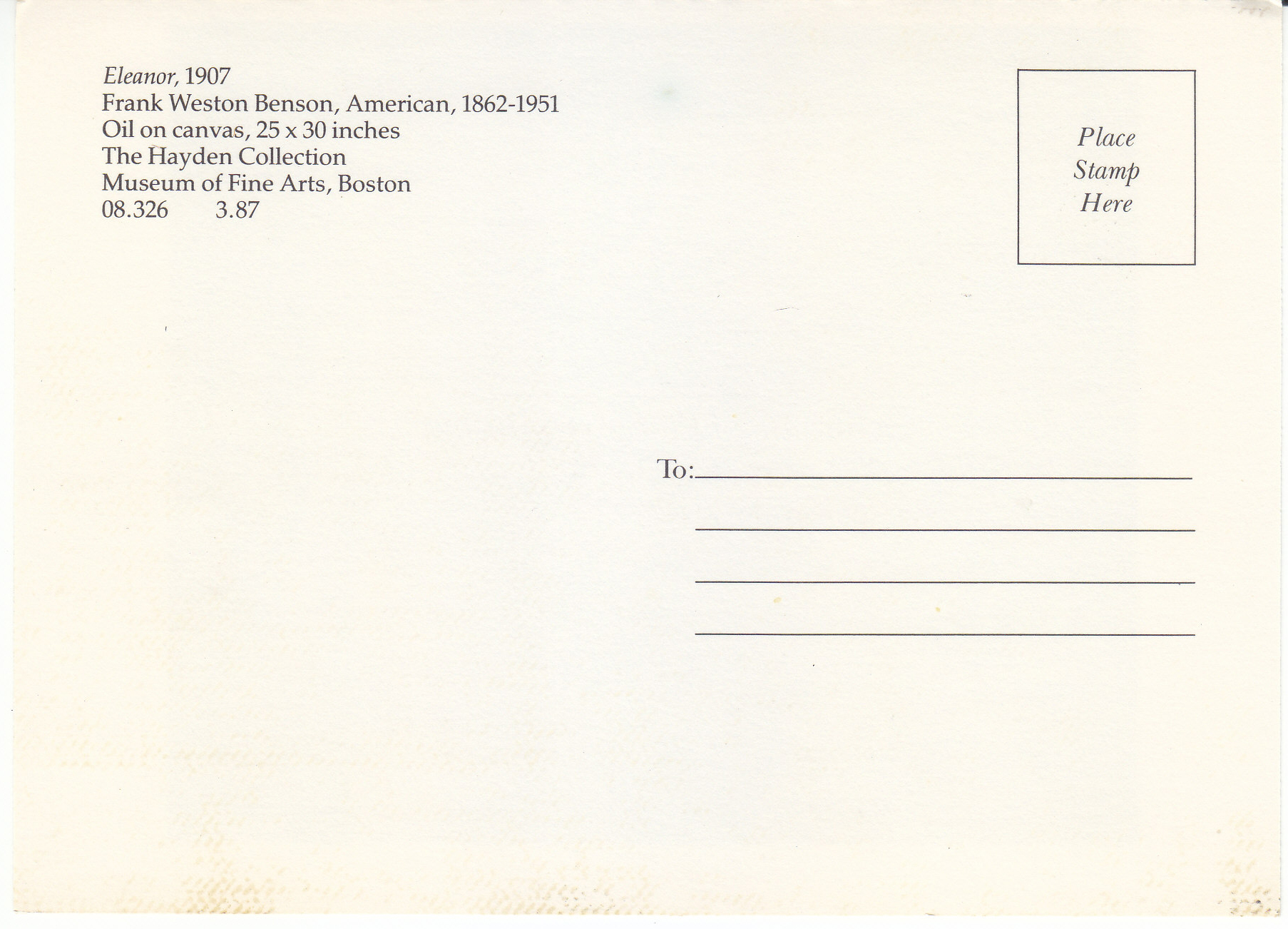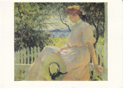 POSTCARD #077 Eleanor, 1907. Frank Weston Benson, American, 1862-1951. Oil on canvas, 25 x 30 inches. The Hayden Collection, Museum of Fine Arts, Boston [MA]. 08.326 3.87. Top of card is deckled from being torn out of a booklet. 6" x 4.25" EXC