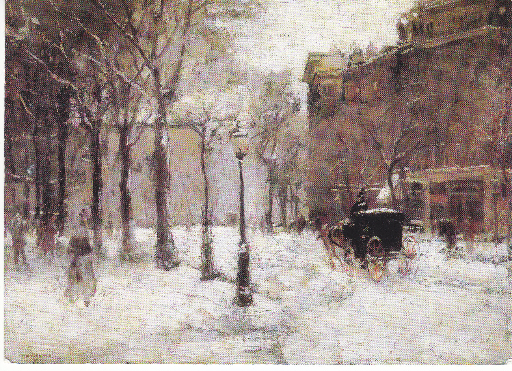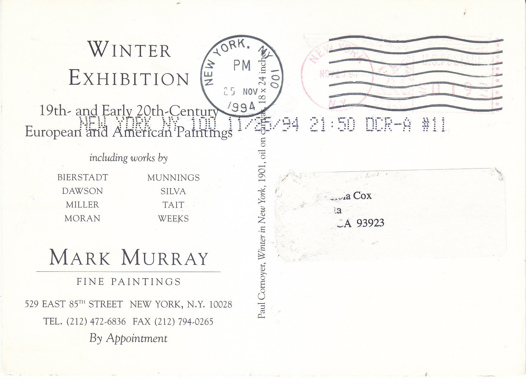 POSTCARD #086 Winter Exhibition. 19th and Early 20th Century European and American Paintings. Including works by: Bierstadt, Dawson, Miller, Moran, Munnings, Silva, Tait, Weeks. Mark Murray Fine Paintings, 529 East 85th Street, New York, N.Y. 10028, Tel., (212) 472-6836, Fax (212) 794-0265. By Appointment. Paul Cornoyer, Winter in New York, 1901, oil on canvas, 18 x 24 inches. 6" x 4.25" VG