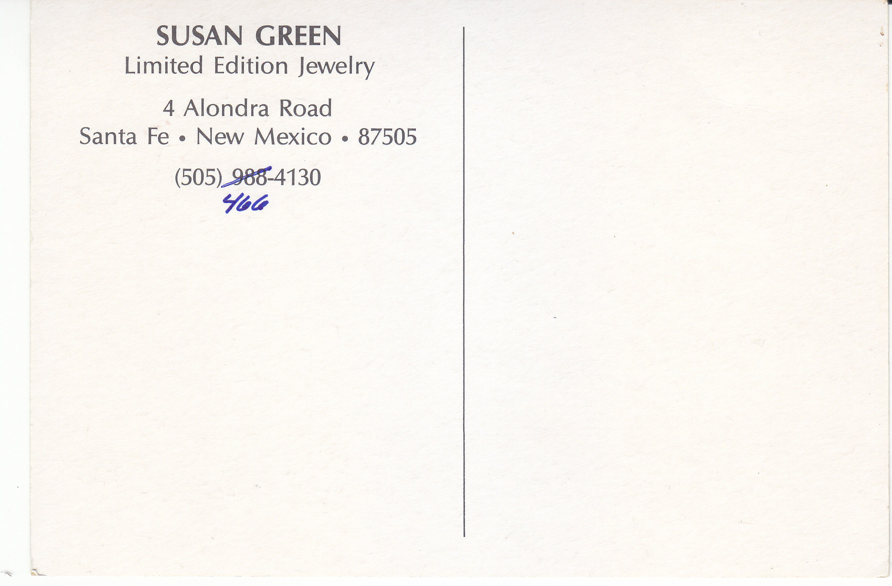 POSTCARD #142 Susan Green. Limited Edition Jewelry. 4 Alondra Road, Santa Fe, New Mexico 87505, (505) 988-4130. Telephone prefix is crossed out and handwritten "466." 6" x 4" VG
