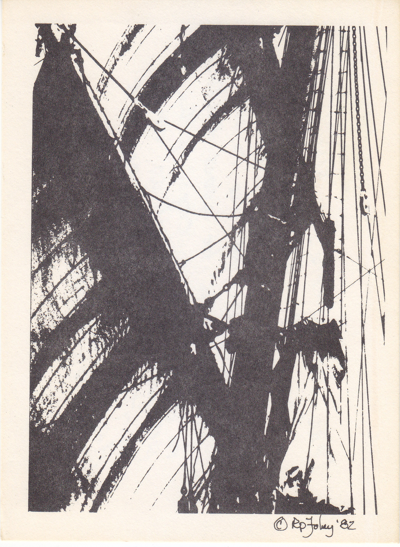 POSTCARD #200 Sailing Ship Rigging. The only text aside from the message is a copyright notice and a signature that looks like "RP Fobrey '82." 4.25 x 5.75" EXC