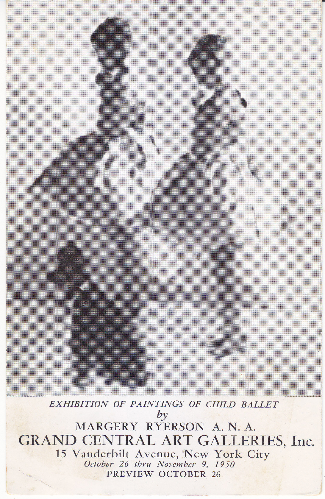 POSTCARD #297 Exhibition of Paintings of Child Ballet by Margery Ryerson A.N.A., Grand Central Art Galleries, Inc., 15 Vanderbilt Avenue, New York City [New York], October 26 thru November 9, 1950, Preview October 26. Postmarked 1950. 3.5" x 5.5" EXC
