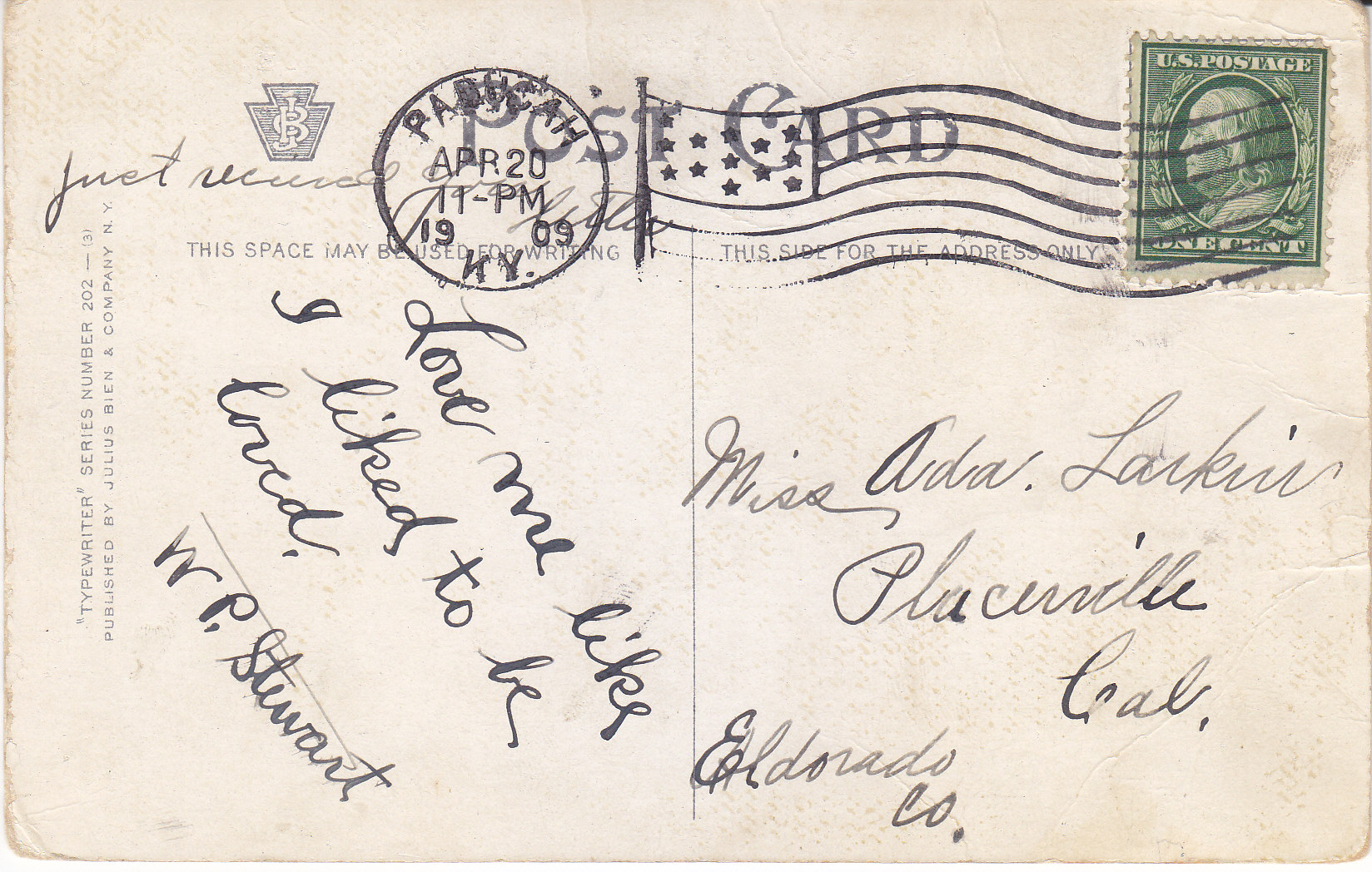POSTCARD #400 Palm to palm in thrilling flashes, Through quickened pulse Love's message dashes. Typewriter Series Number 202-(3). Published by Julius Bien & Company N.Y. [New York]. 5.5" x 3.5"GD