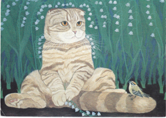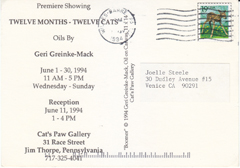 POSTCARD #087 Premier Showing. Twelve Months-Twelve Cats. Oils by Geri Greinke-Mack. June 1-30, 1994, 11 a.m. - 5 p.m., Wednesday-Sunday. Reception June 11, 1994, 1-4 p.m. Cat's Paw Gallery, 31 Race Street, Jim Thorpe, Pennsylvania, 717-325-4041. Boomer, copyright 1994 Geri Greinke-Mack, Oil on Canvas, 11 x 14, Cat's Paw Gallery. 6" x 4.5" VG
