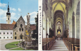 POSTCARD #991 Cistercienser Abtei Heiligenkreuz, N.Ö. [Heiligenkreuz Cistercian Abbey, Lower Austria, founded 1133]. Buchhandlung Stift Heiligenkreuz, N.Ö. Each card is 4" x 3". 10 images: Cistercian Abbey; Abbey Church Nave Romanesque; Byzantine Cross of 1158; Abbey Church; Choir Stalls of the Abbey by Giuliani 1708; Cloister; Chapter House with Tomb of Friedrich the "Valiant" d. 1246; Chapel of the Death; Lead Fountain; Virgin with Child. Image and reverse sides are EXC except for the first card which has some spots in the sky.