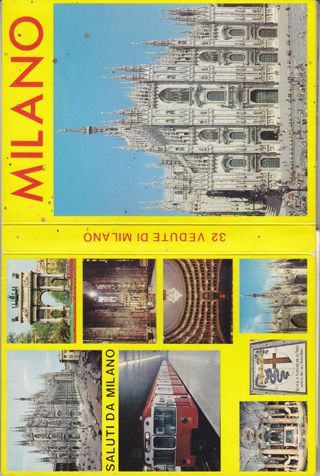 POSTCARD #993 Milano [Milan, Italy]. Each card is 5.75" x 4". 20 images: Cover has images as shown, and the reverse of them is a map of central Milan; Cathedral Plaza; Cathedral; Cathedral at Night; 2-image card with Main Spire of Cathedral and Interior of Cathedral; 2-image card with statue of Saint Bartholomew and Stained Glass Window of Cathedral; Vittorio Emanuele Gallery; Viktor Emanuel Gallerie; La Scala Theatre and Square; Scala Theater Interior; Last Supper by da Vinci; Church of S. Maria delle Grazie; Basilica of S. Ambrogio; 2-image card with Saint Ambroise small door and Basilica of San Ambrosio Atrium; The Canal; 2-image card with Golden Altar of Volvinio and Monument to the Soldiers Killed in the War; The Sforzesco Castle; Front of the new Central Station of Milan. All images and reverse sides are EXC, except for the front cover image of the Cathedral, which has spots on it.