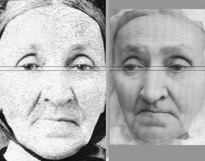 In this case, preparing the photos ruled out a match. Here’s why: When the pupils were aligned horizontally and the irises were made the same size – in this case half-irises due to the heavy upper lids – it was extremely easy to see that this was not the same woman. Mary, on the left, has eyes that are smaller in proportion to her face. Susannah, on the right, has eyes that are larger in proportion to her face. So, in the end, this makes Mary’s head noticeably larger than Susannah’s.