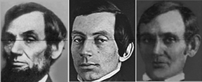 Now, you might be thinking it's not possible to measure two faces and compare the measurements, and you are absolutely correct. You cannot measure features in one photo and then compare them to the other as did Claude N. Frechette, MD, a plastic and reconstructive surgeon who was hired in 1987 by a man named Albert Kaplan to analyze an old Daguerreotype that he believed was that of a young Lincoln. Below is Frechette's comparison of Kaplan's photo (far left), the Meserve #1 photo of Lincoln taken by Shepherd in 1846 (middle) and an 1862 Brady photo of Lincoln (far right).
