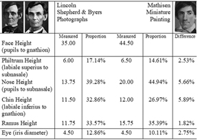 But back to hard facts. All proportions must match from one face to another to have a match. The greatest allowable difference for any given facial feature to be a match is 0.5% (0.75% in non-photo media). In the comparison of the Lincoln photos with the miniature, the differences exceed this by 1.32% to 5.84%, and that absolutely rules out a match.