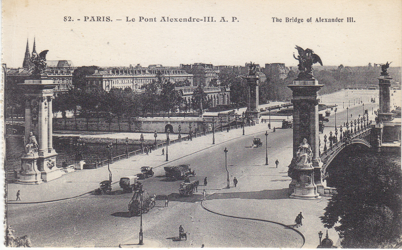 POSTCARD #022 Le Pont Alexandre-III [Bridge of Alexander III, Paris, France]. 82. A.P., E. Papeghin, 24 Rue des Petites-Ecuries, Paris. Rough edge on left where it was torn out of a booklet. 5.5" x 3.5" EXC